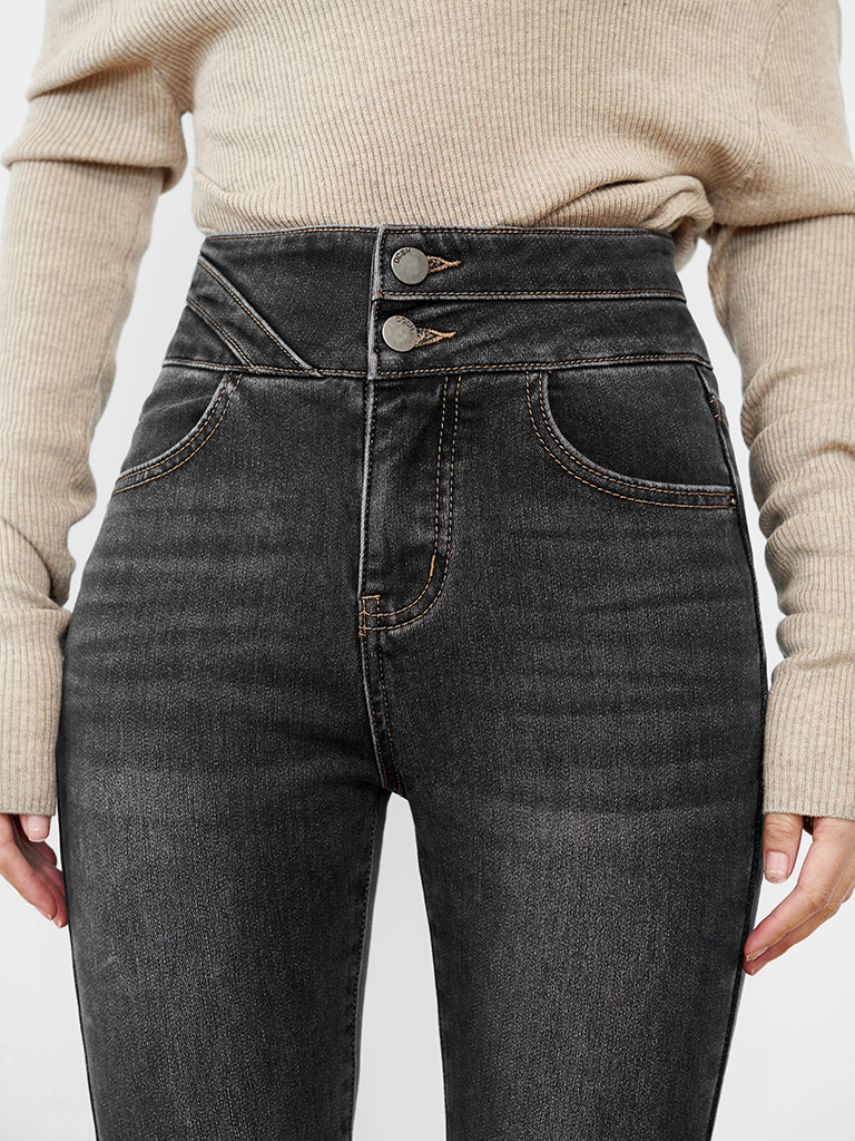 SJOG保暖新科技~烟灰色加绒两粒扣高腰牛仔裤 女九分显瘦小脚靴裤
