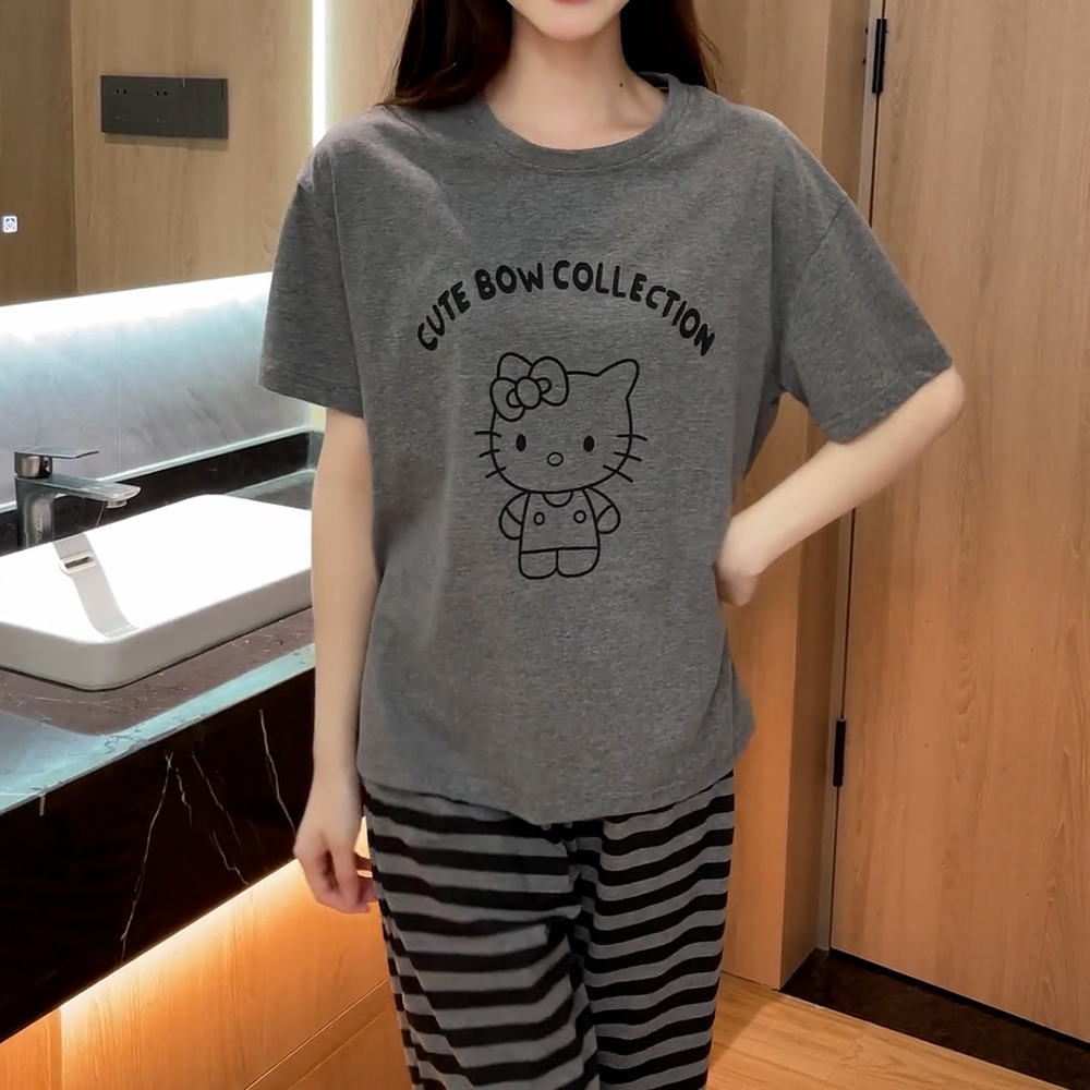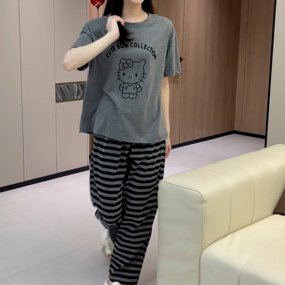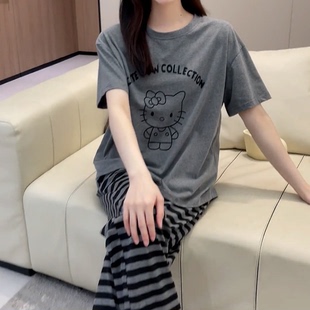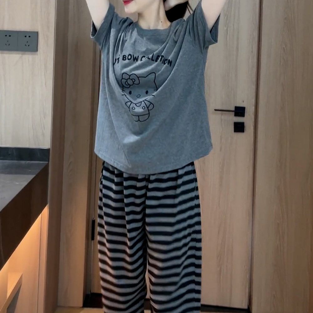 睡衣套装 带胸垫卡通短袖 女圆领休闲可外穿灰色家居服 新款 2025夏季