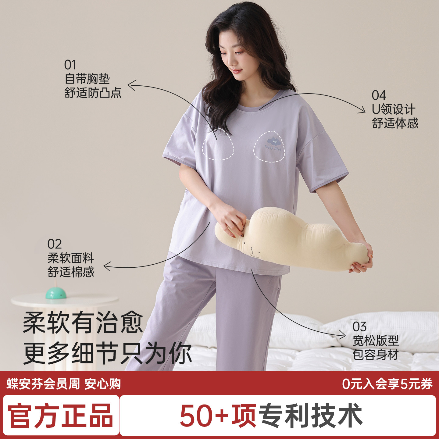 女透气外穿带胸垫免穿文胸家居服 睡衣套装 蝶安芬云朵短袖 七分裤