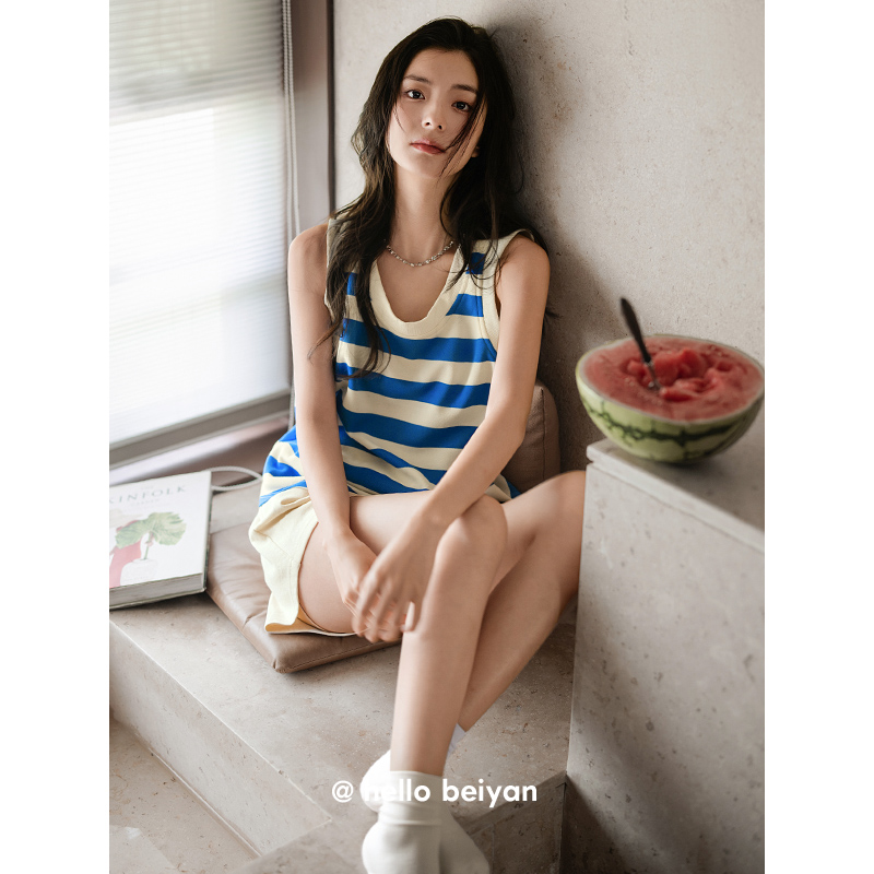 家居服外穿运动套装 贝妍凉感莫代尔棉睡衣女夏季 撞色条纹背心短裤