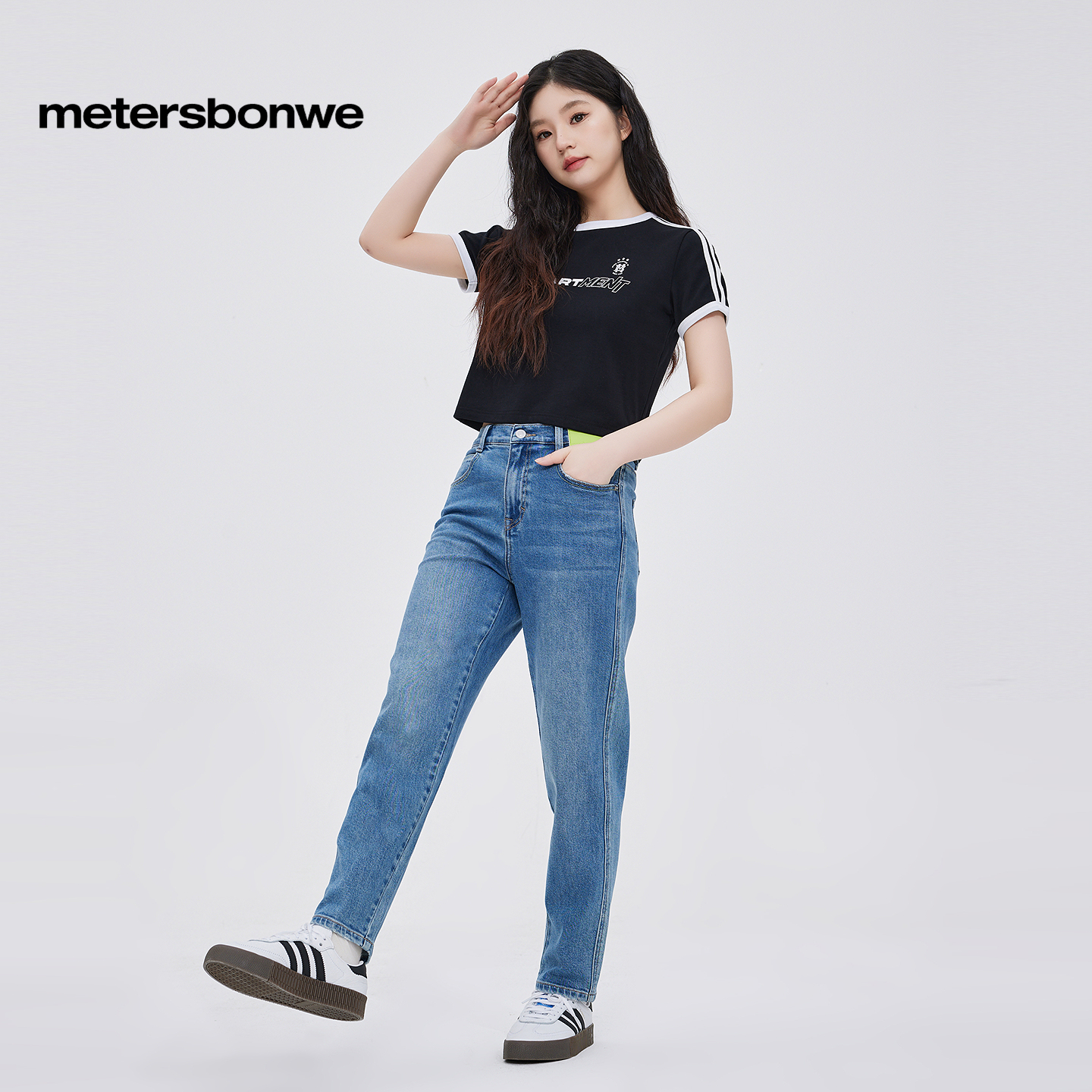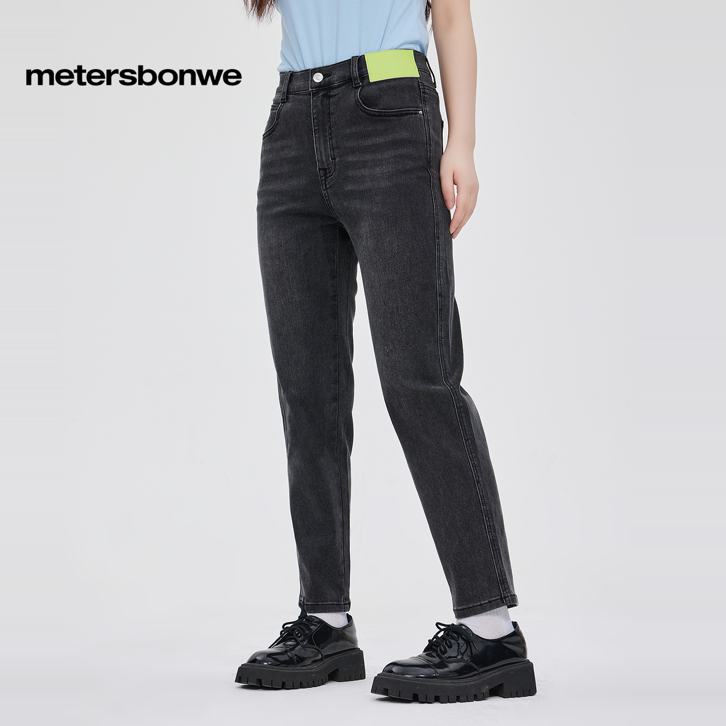 潮流高腰牛仔裤 长裤 四季 撞色线百搭萝卜裤 水洗时尚 美特斯邦威女款