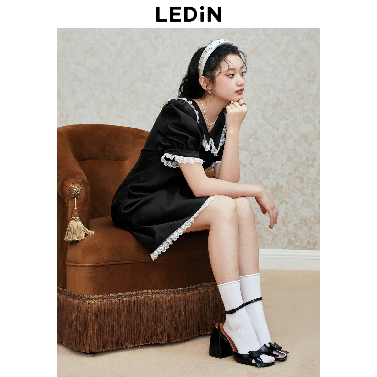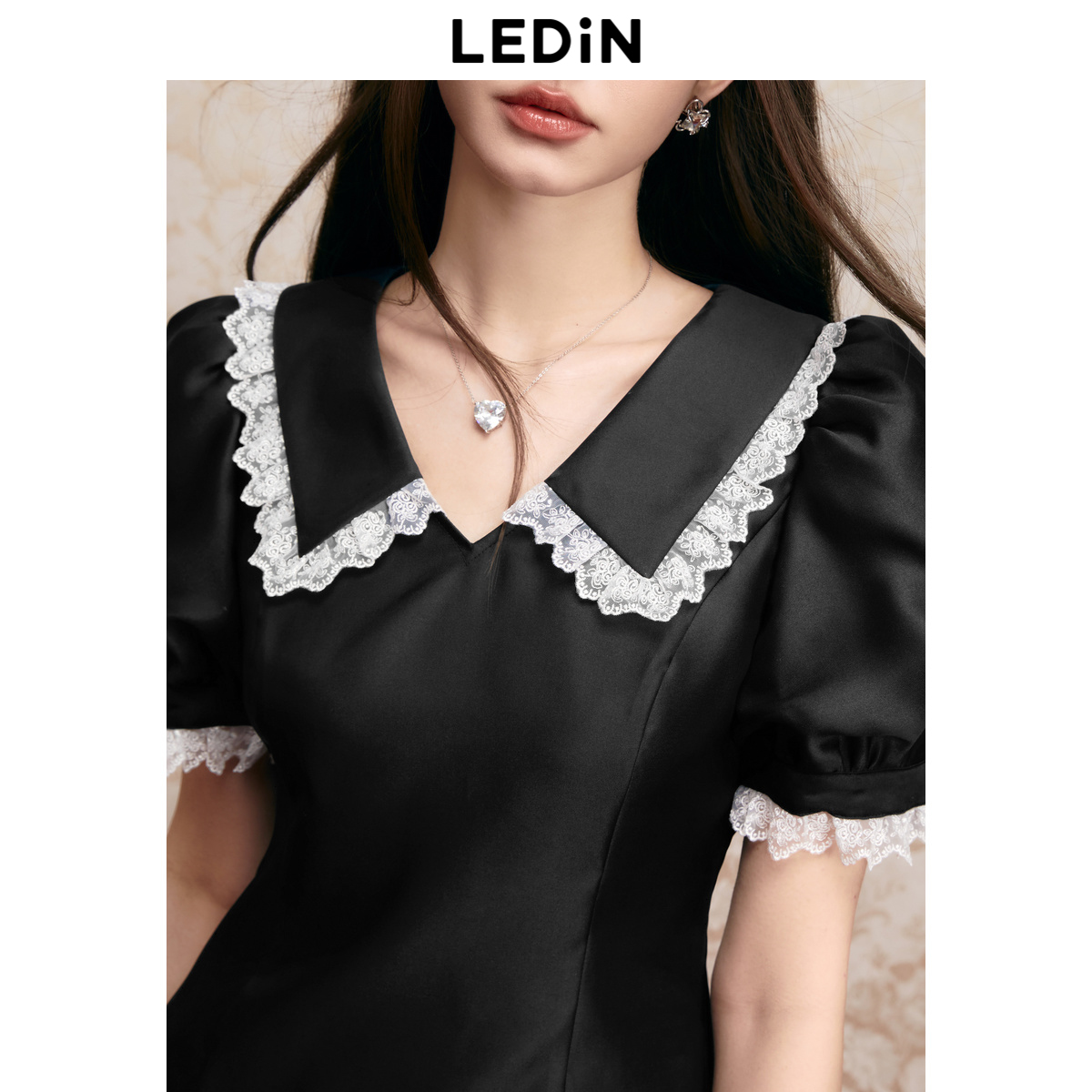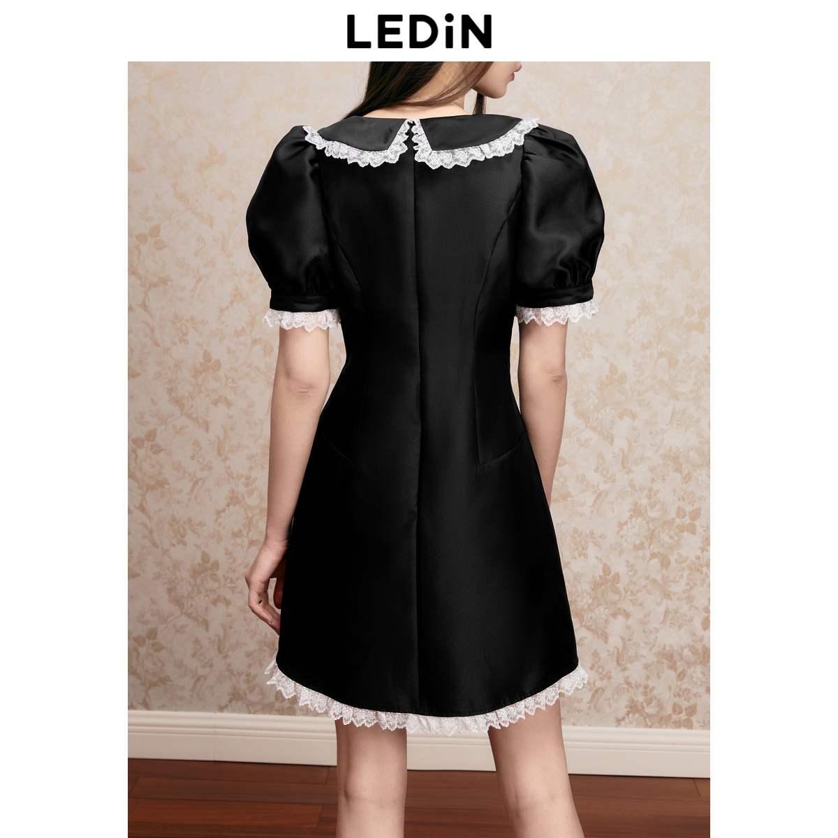 收腰黑色短袖 翻领连衣裙夏季 乐町修身 裙缎面质感连衣裙 清仓