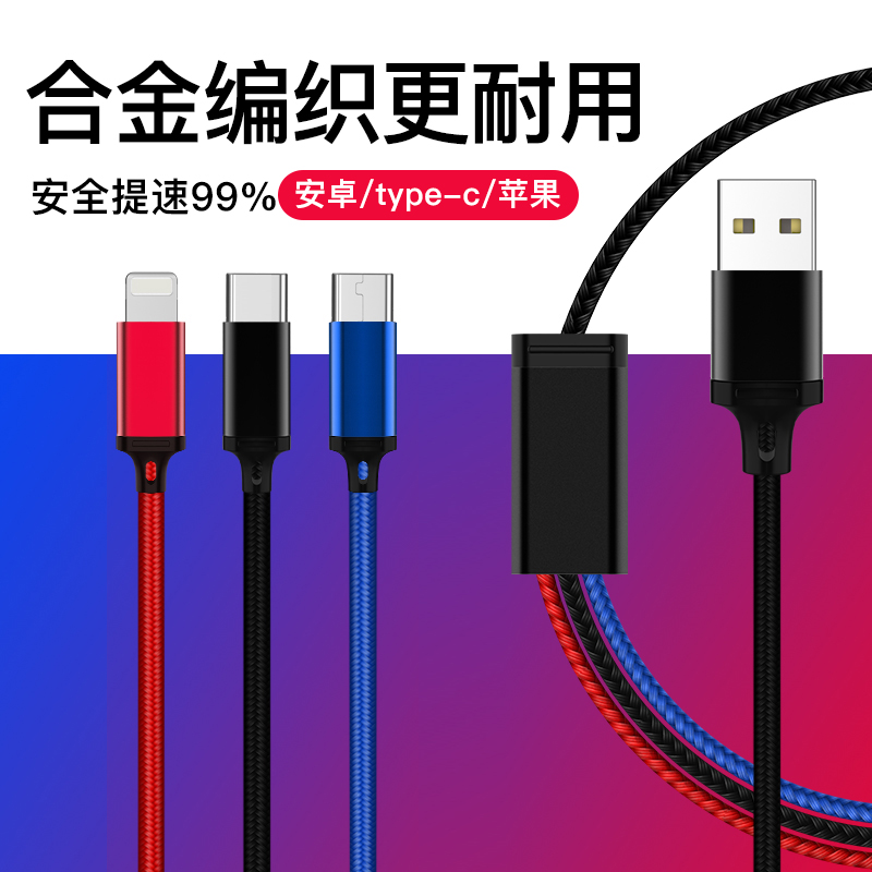 民外数据线三合一快充充电线一拖三车载万能通用适用于苹果华为手机多头多功能安卓typec汽车三头usb5a冲电