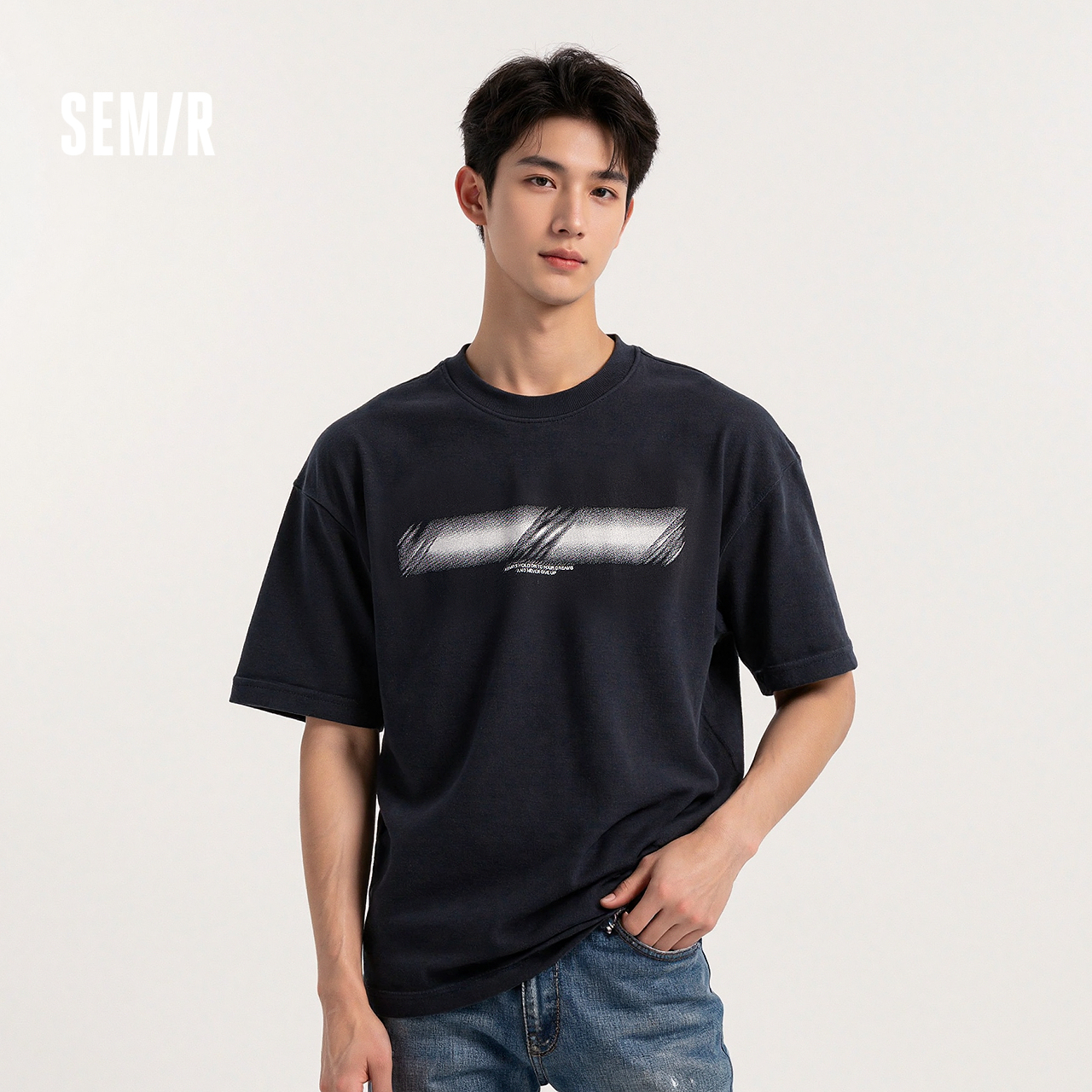 简约百搭 宽松落肩休闲装 森马短袖 T恤男撞色印花圆领针织上衣秋季