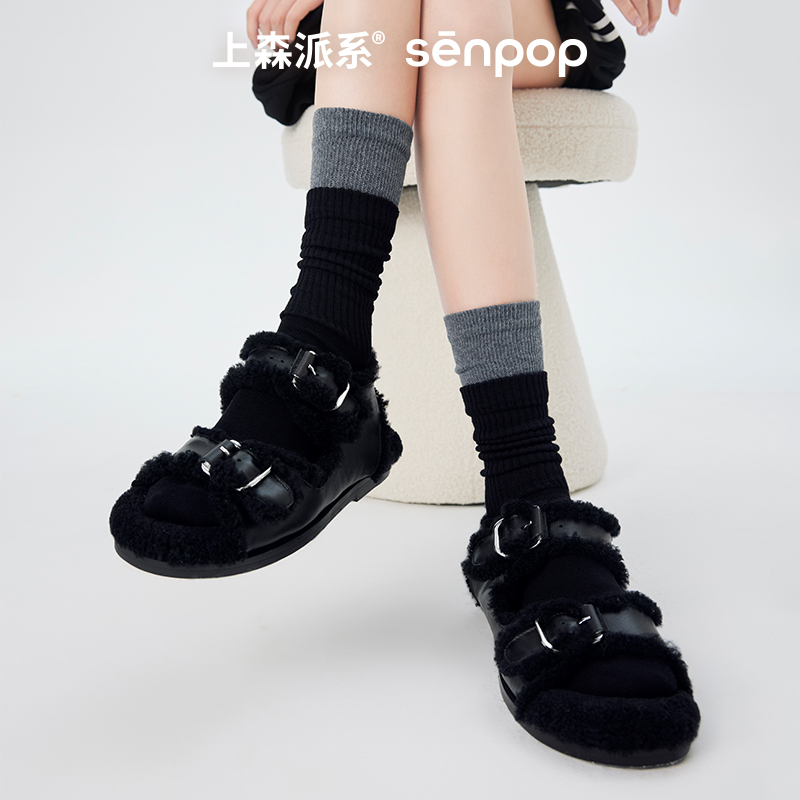 上森咖色小腿袜子女秋冬堆堆袜撞色红色长袜中筒袜棕色配勃肯鞋 袜