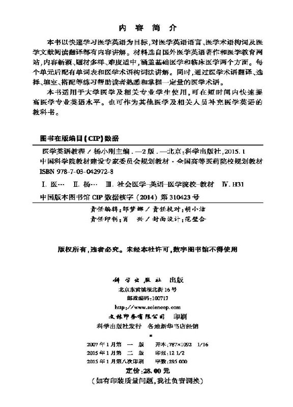 书 科学出版 医学英语教程 杨小刚 社有限责任公司9787030429728书籍KX 第2版