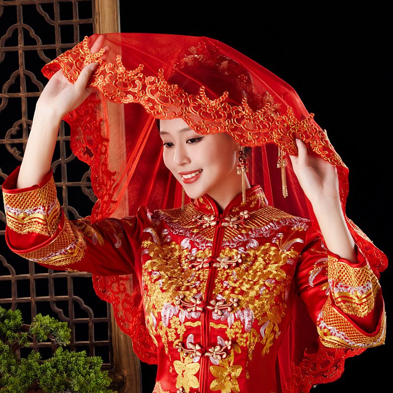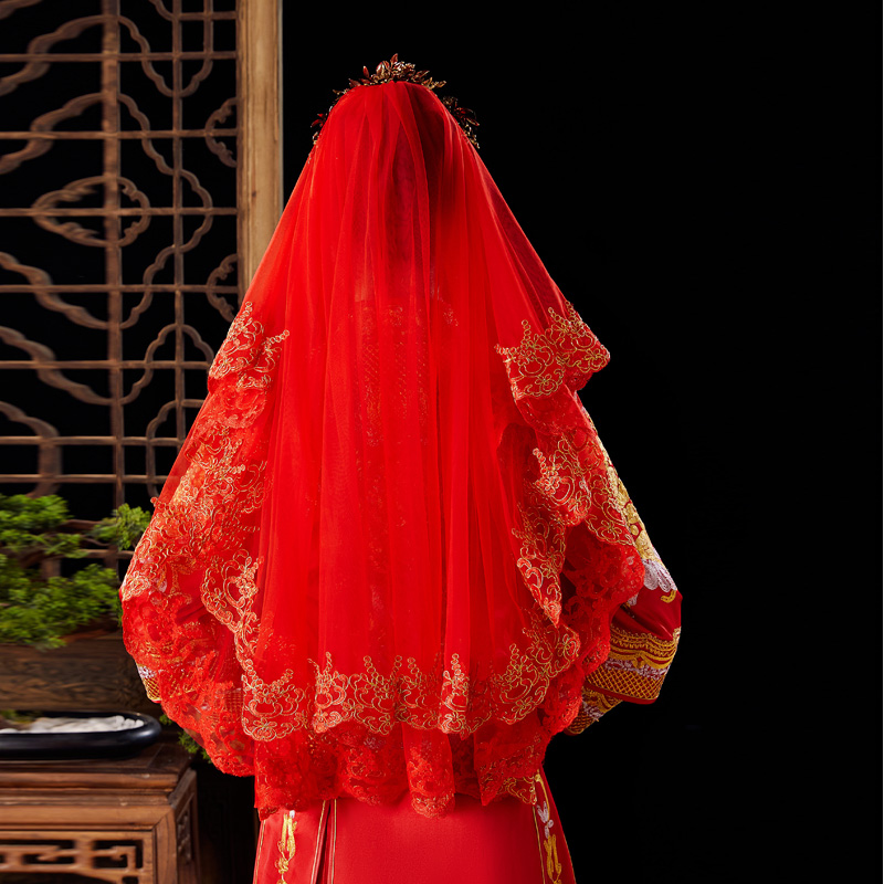 新娘红盖头结婚苏绣半透明头纱2022秀禾服喜帕中式 婚礼红色蒙头巾