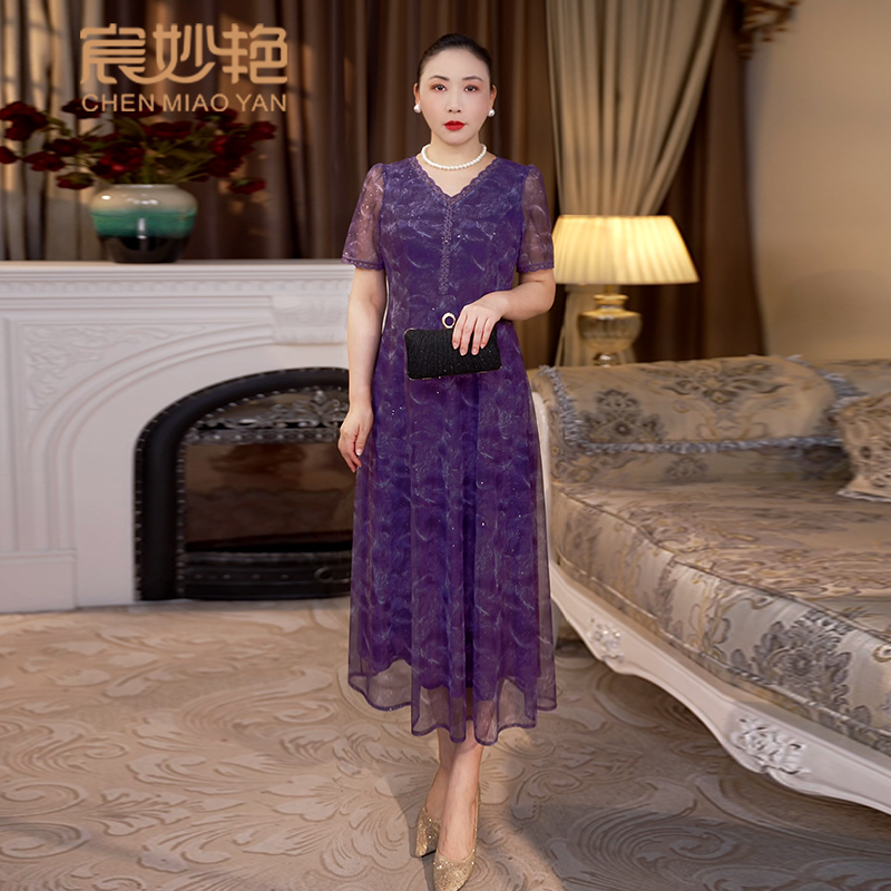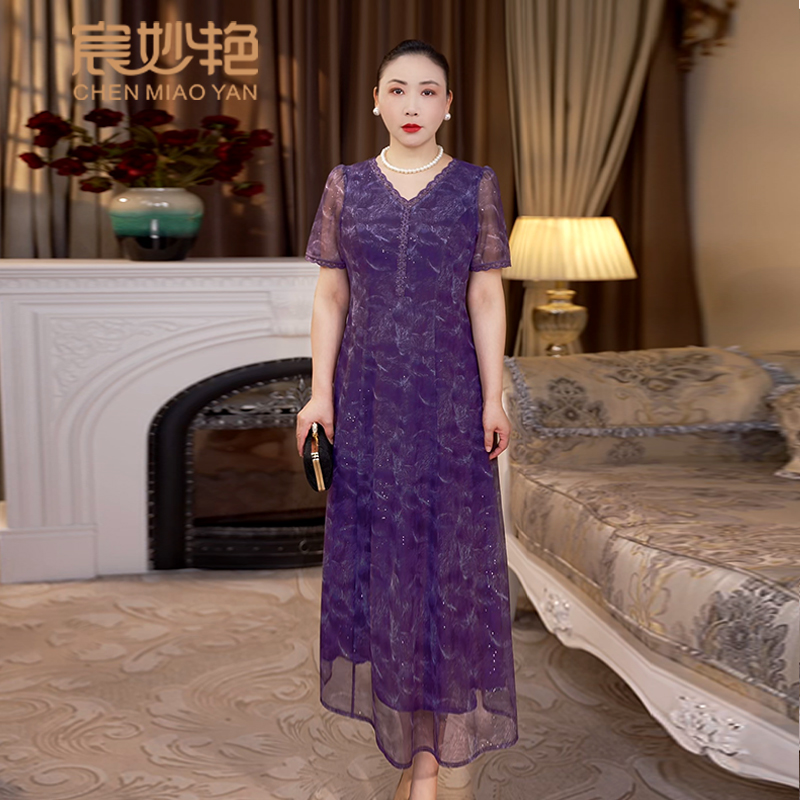 高贵优雅气质连衣裙重工刺绣阔太太长裙修身 显瘦弹力水晶纱碎花裙