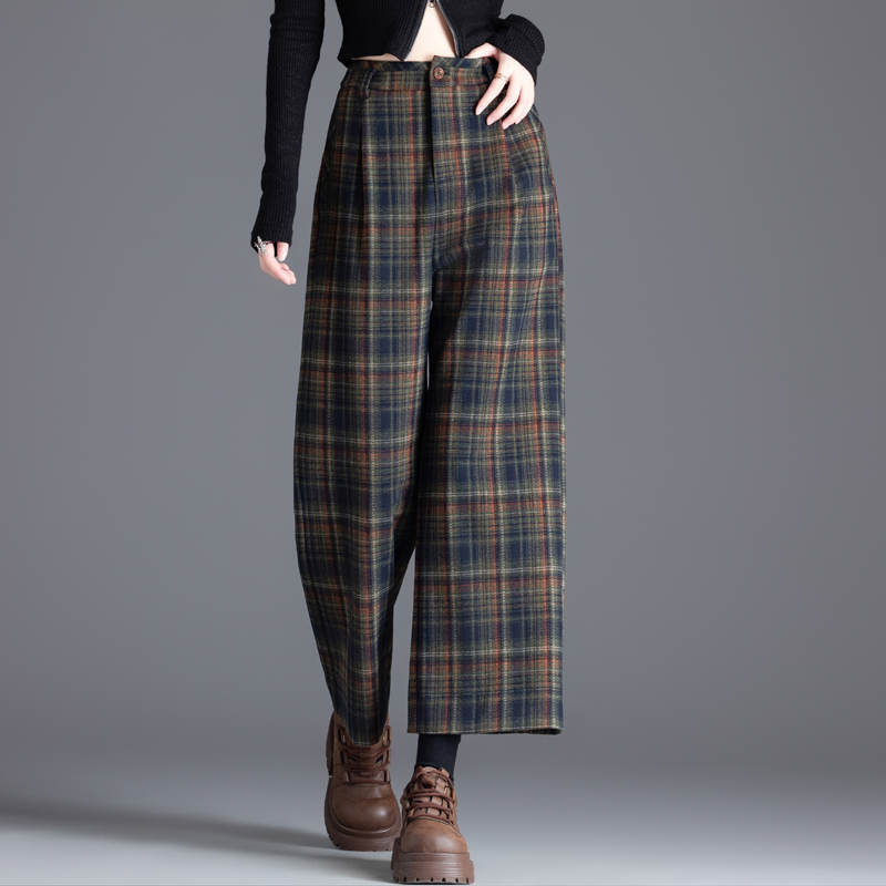 阔腿裤 咖色毛呢裤 子女秋冬天加厚小个子九分直筒休闲裤 羊毛格子裤