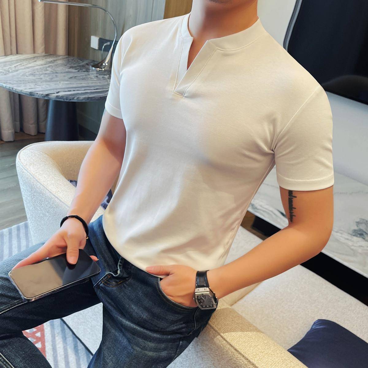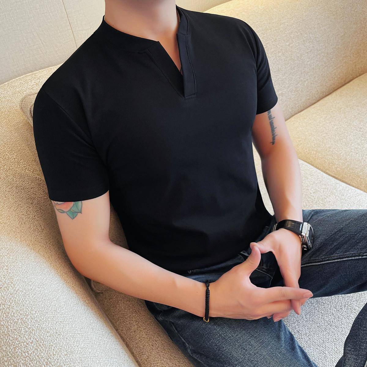 纯法式 2025新款 紧身修身 t恤男士 大V领高级感痞帅亨利领0703r 短袖