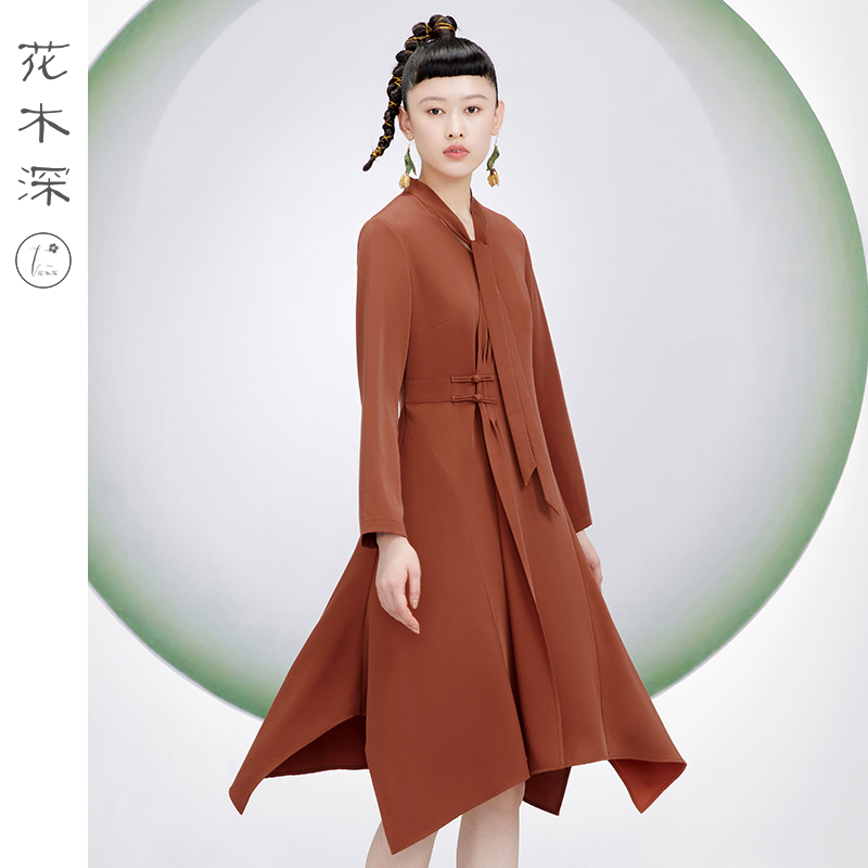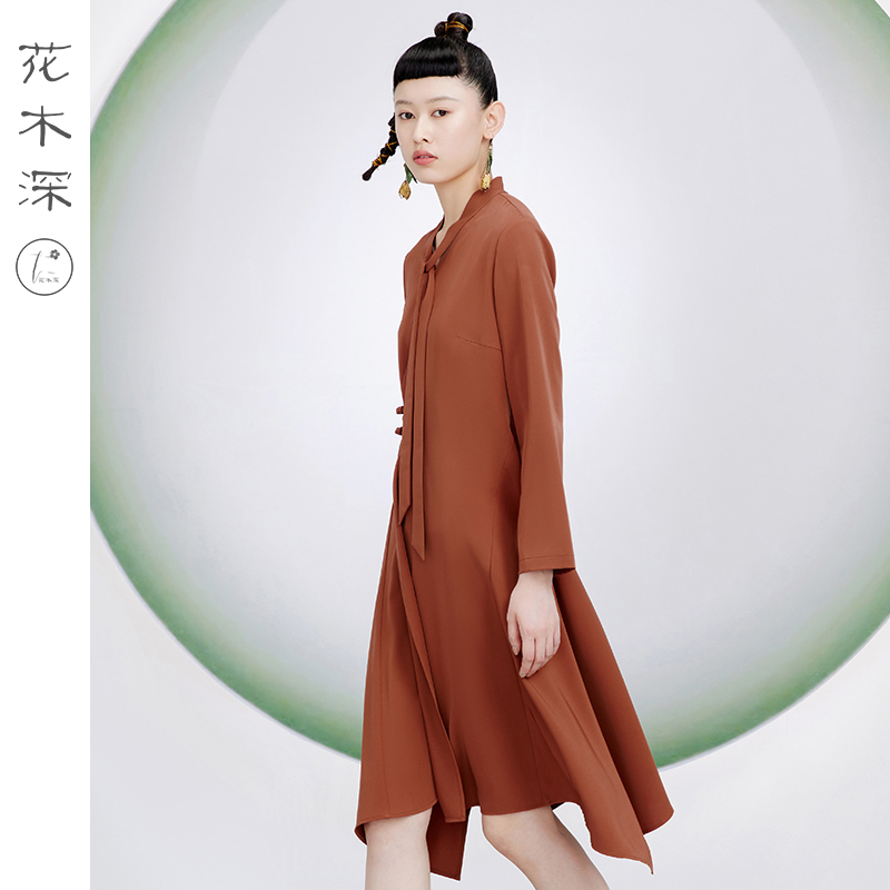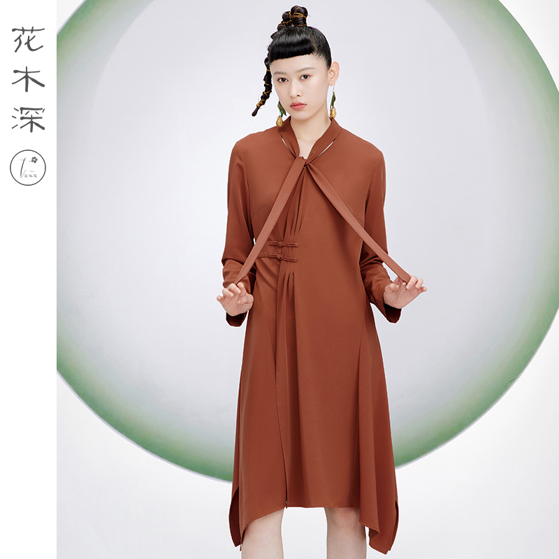 A字裙 盘扣长袖 花木深不规则连衣裙设计感小众修身 中长裙子女中式