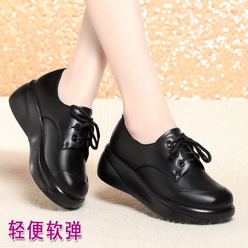 女款 大码 春秋坡跟厚底女鞋 中老年妈妈鞋 中年女士皮鞋 真皮松糕单鞋
