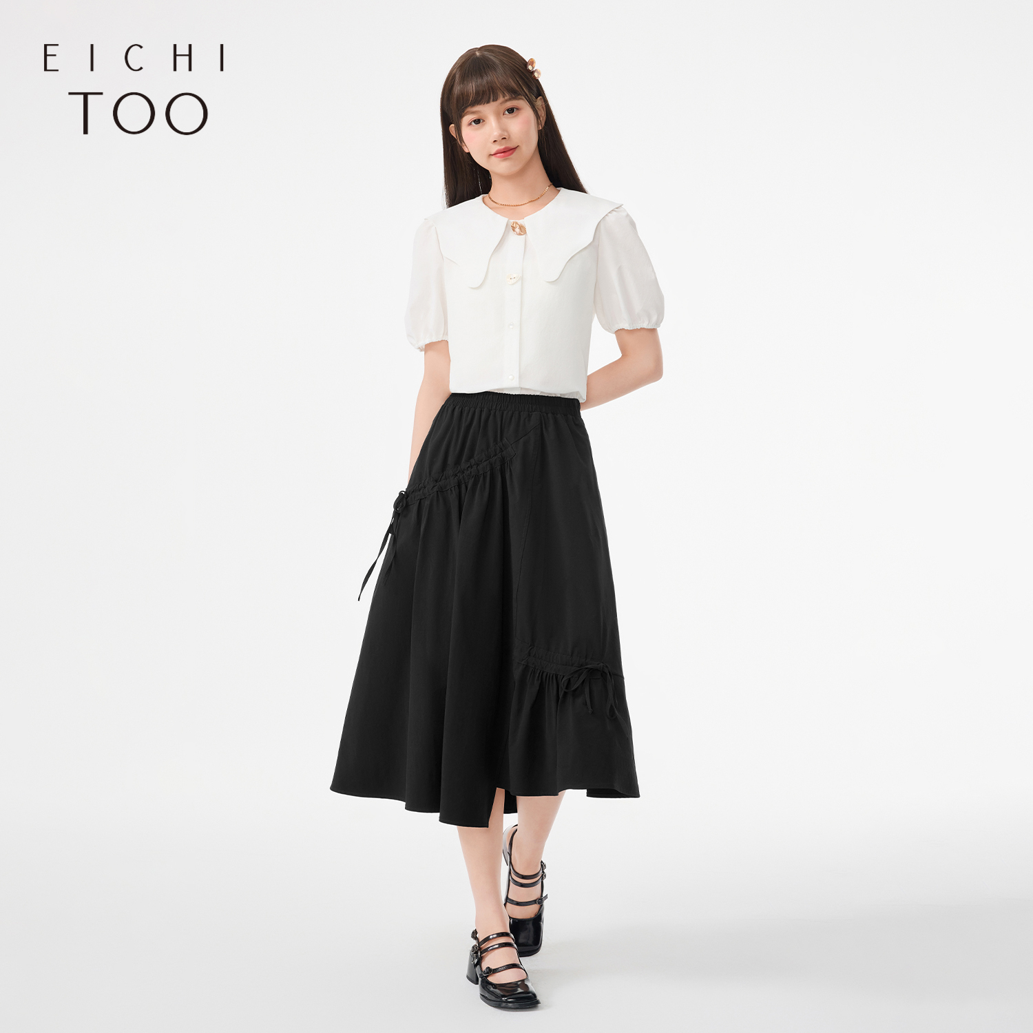 爱居兔夏季 抽褶系绳纯黑色半身裙小黑裙 新款