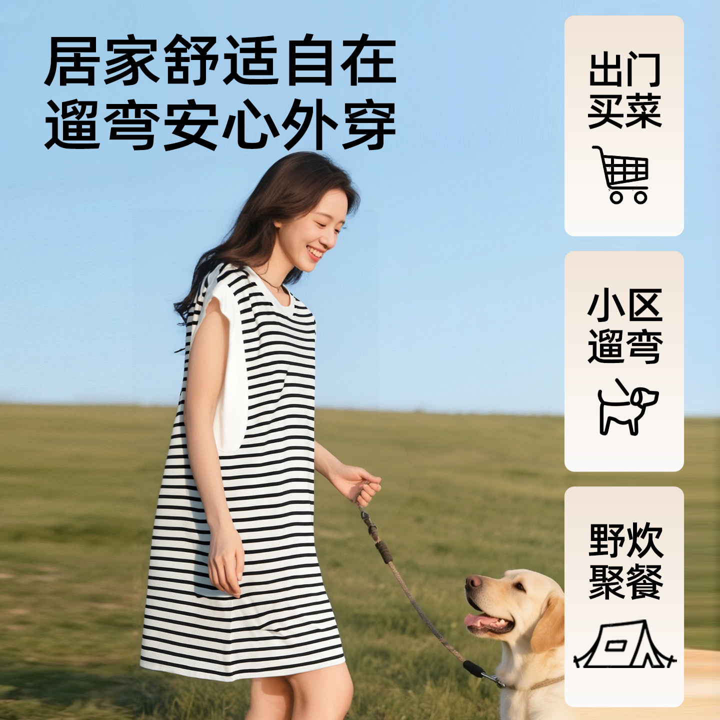 大码 长裙家居服夏款 条纹休闲可外穿 纯棉短袖 悦内睡裙女士睡衣夏季