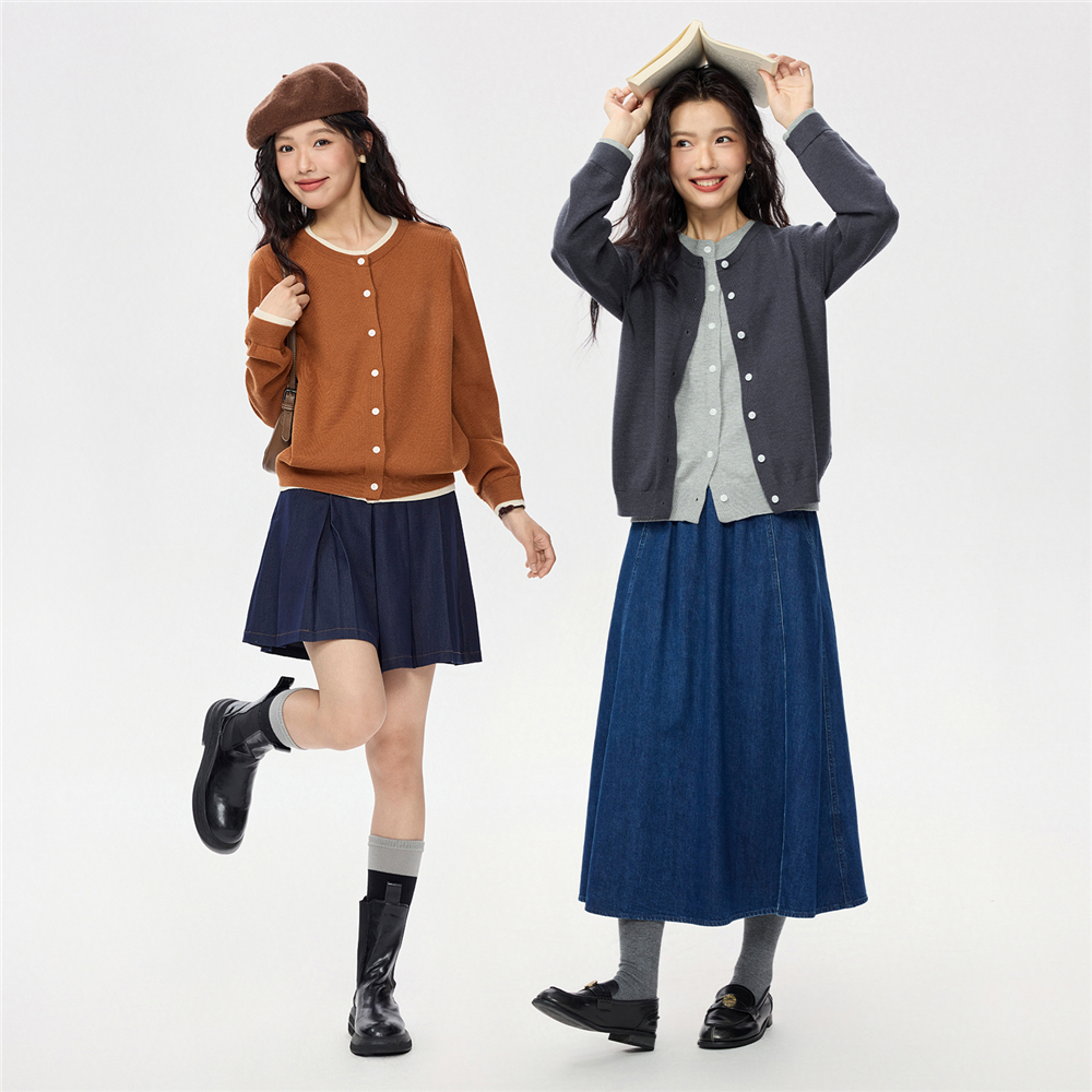 佐丹奴假两件针织开衫 撞色圆领针织外套13355753 女秋冬叠穿针织衫