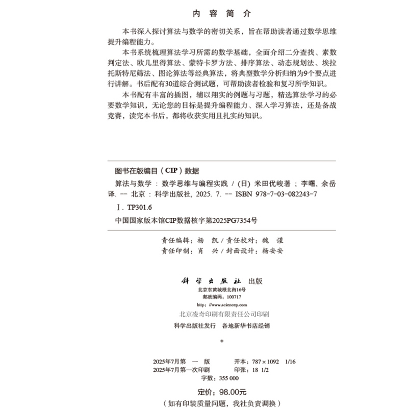 米田优峻 著 科学出版 算法与数学:数学思维与编程实践 社9787030822437 译 日 余岳译 现货速发 李曙