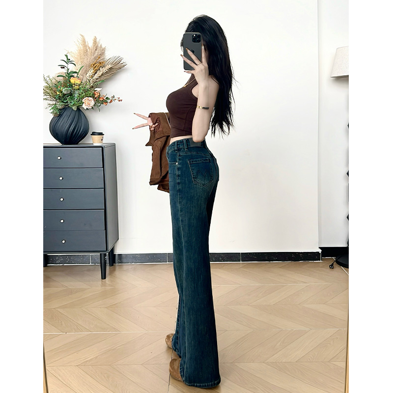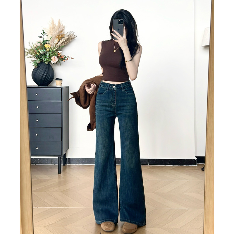 高腰显瘦长裤 女秋冬加绒新款 复古不贴腿微喇阔腿牛仔裤 乔栈美式