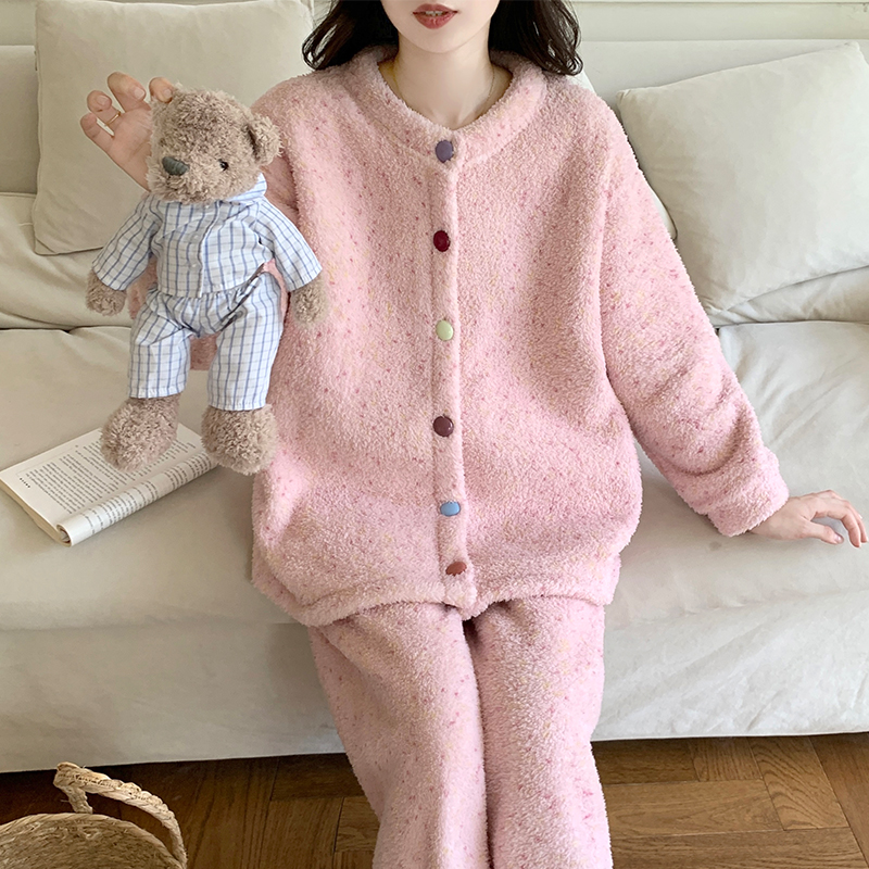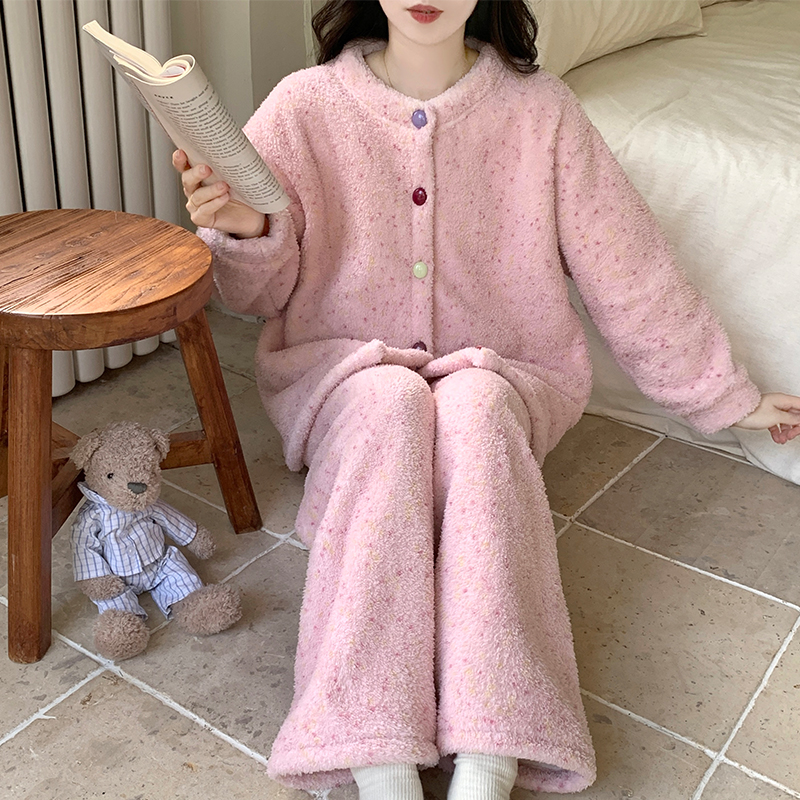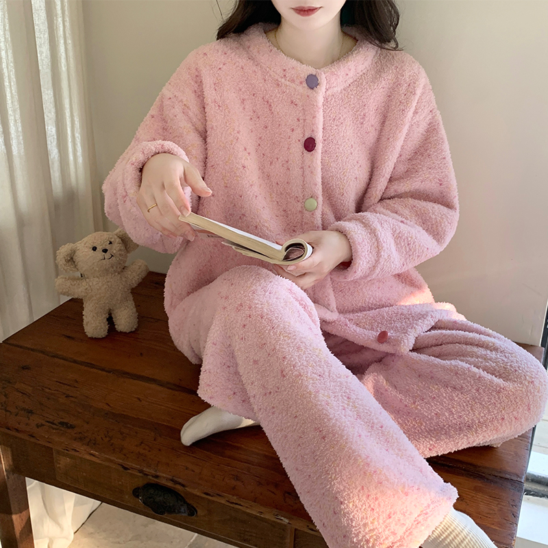 可外穿珊瑚绒家居服女抗静电冬季 红豆居家女士羊羔绒睡衣套装 开衫