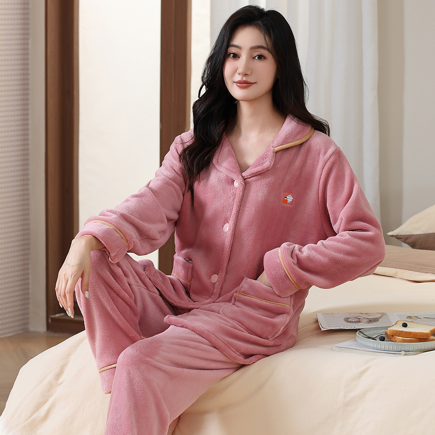 法兰绒加厚加绒睡衣女套装 宜而爽翻领开衫 秋冬款 长裤 柔软保暖长袖