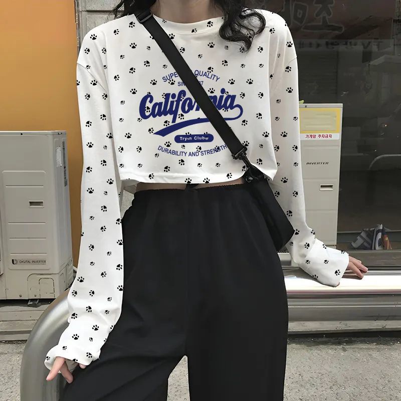 宽松设计感小众慵懒风ins上衣服 T恤女生2025韩版 纯棉印花短款 长袖