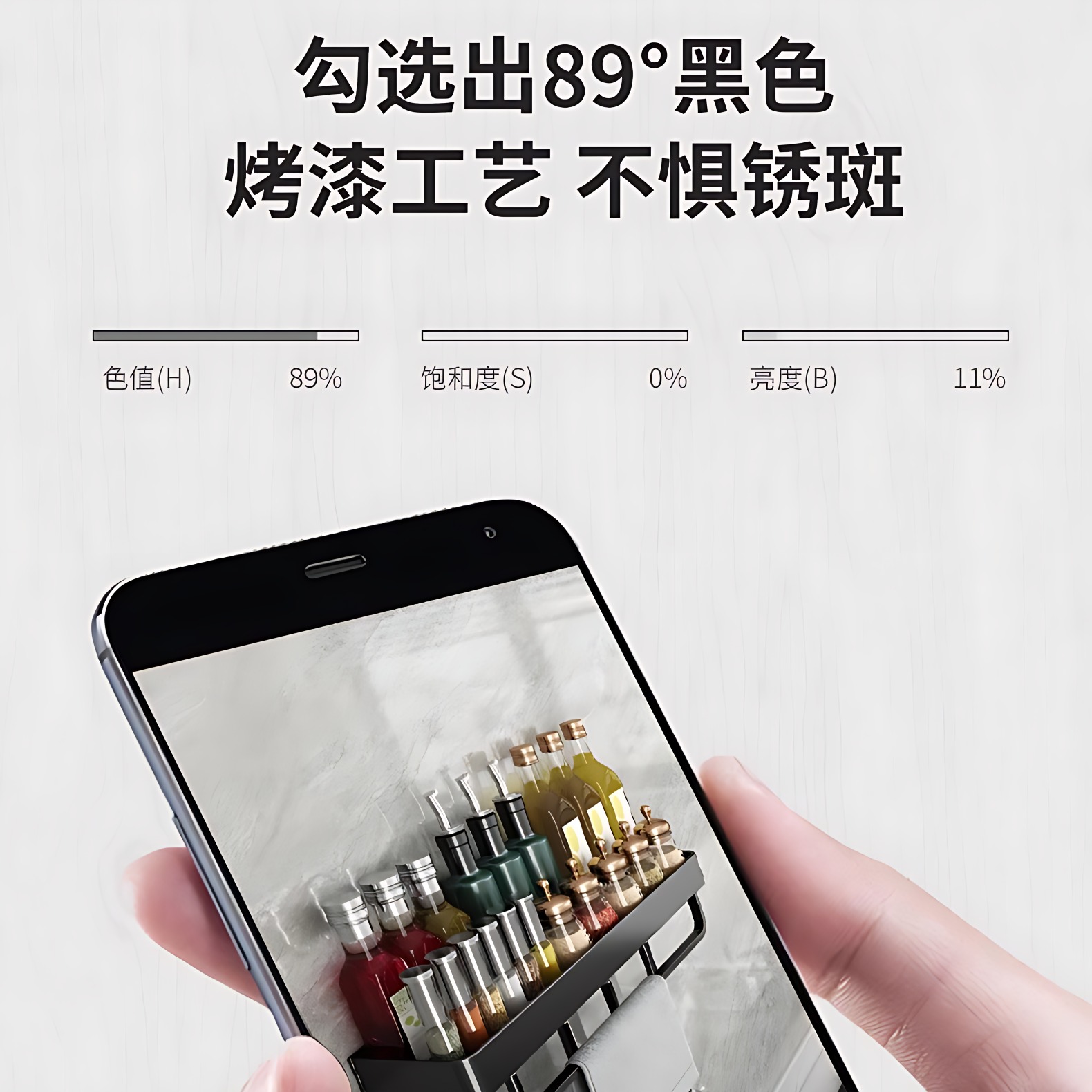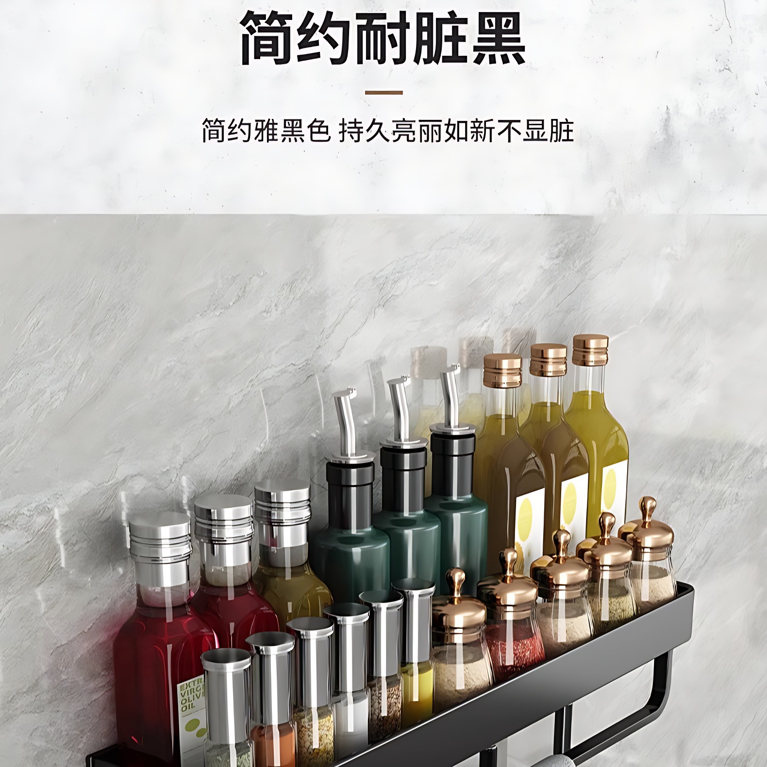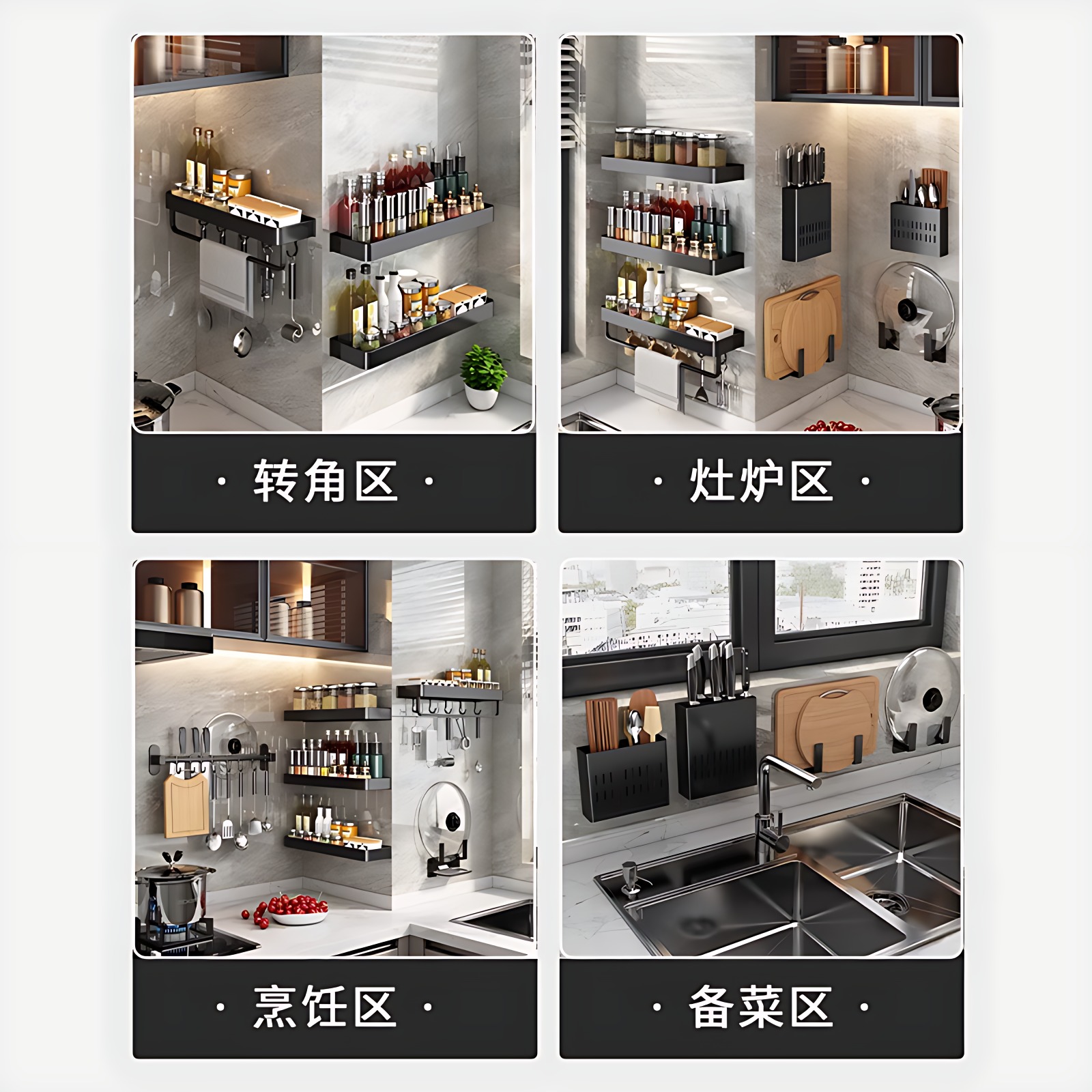 黑色厨房置物架壁挂式 免打孔家用太空铝多功能收纳刀架调味料挂架