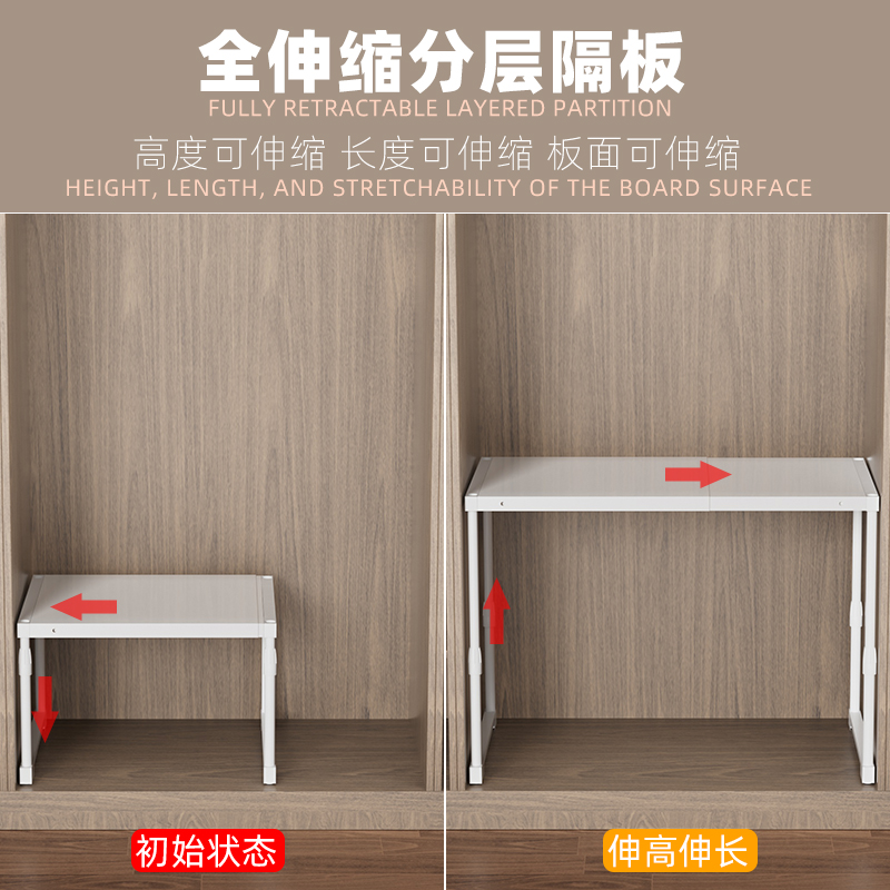 衣橱柜子内分层隔板免打孔收纳神器可伸缩置物架碳钢隔断层整理板