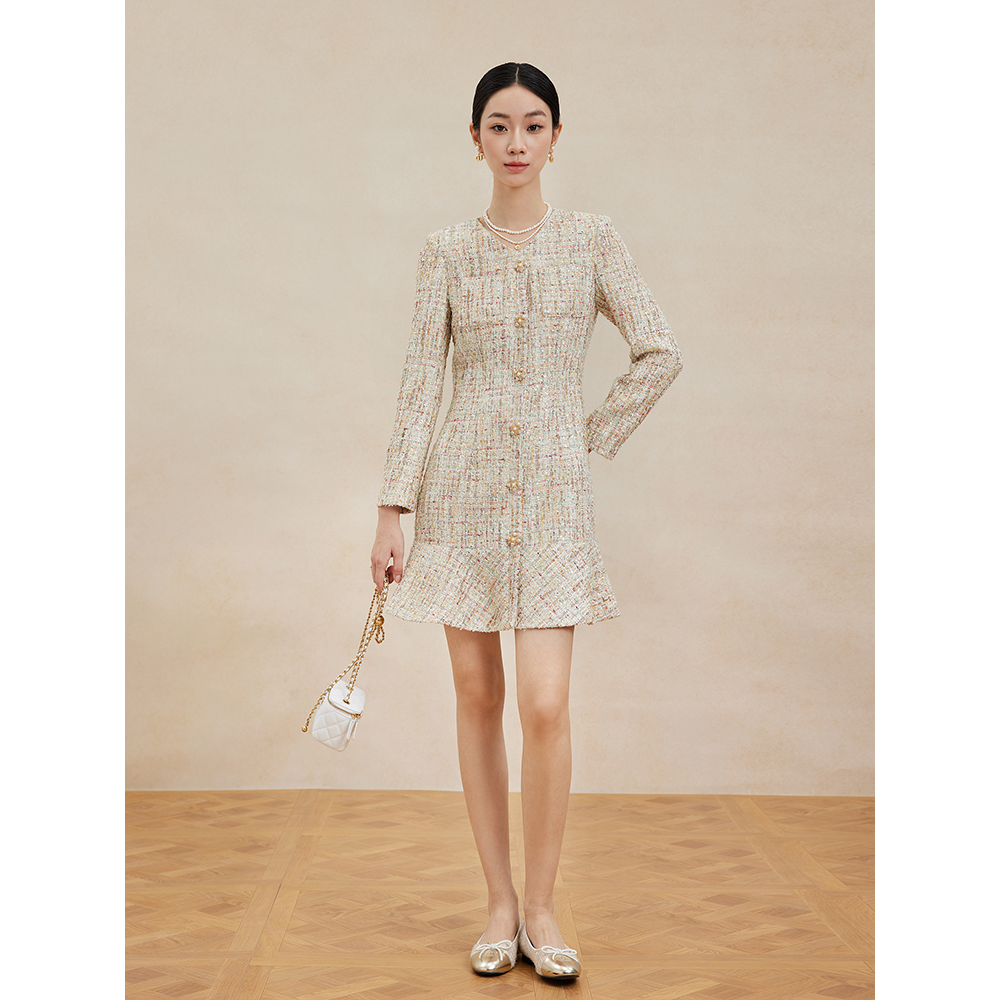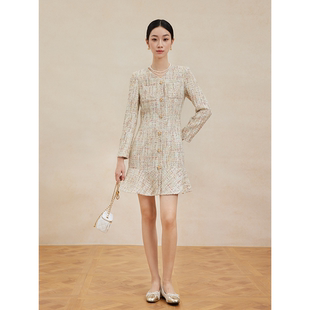 爵莱菲大码 进口花纱2025小香编织粗花呢高腰V领减龄荷叶摆连衣裙