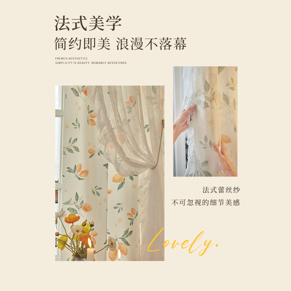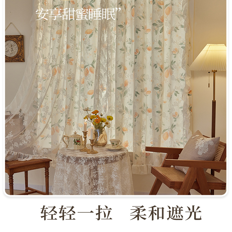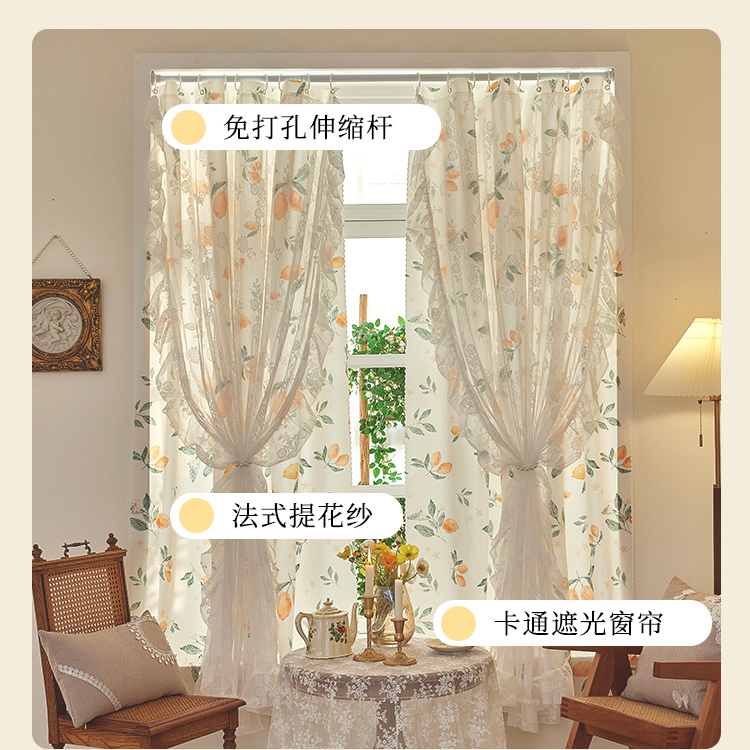 双层遮光卧室窗帘纱布一体免打孔公主风法式 田园ins网红蕾丝门帘
