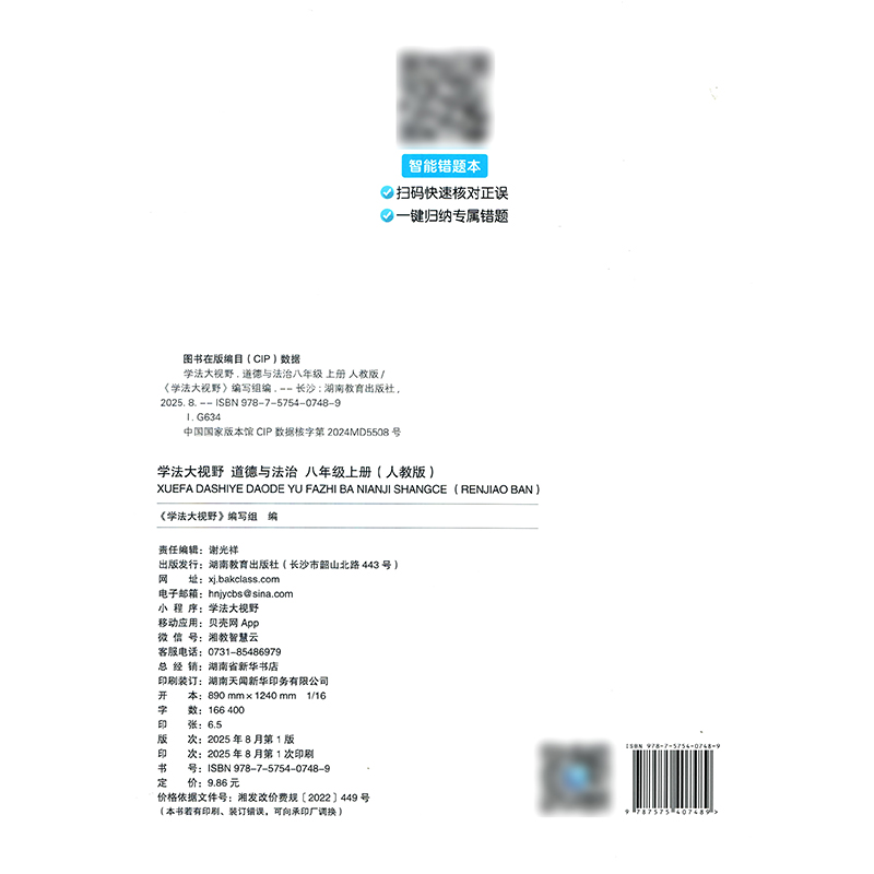 同步练 2025年长沙版 社全新正版 RJ初中初二2上湖南教育出版 综合练含答案道德与法治 基础作业学法大视野政治8八年级上册人教版