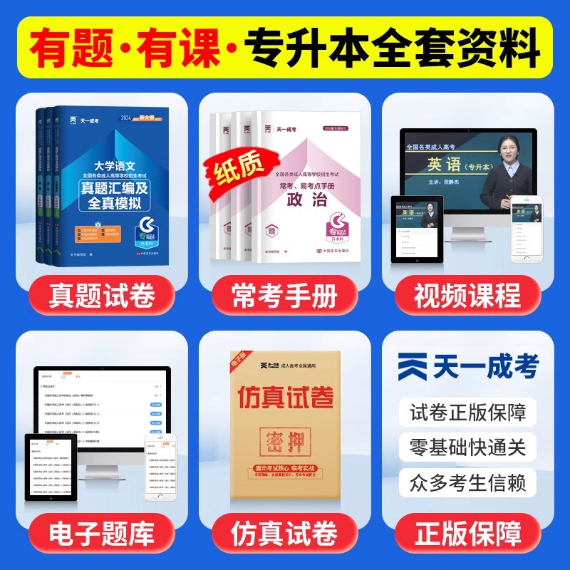 天一成考专升本复习资料2025自学考试成人高考专升本教材政治医学综合语文英语高等数学二民法教育理论历年真题试卷题库自考专升本