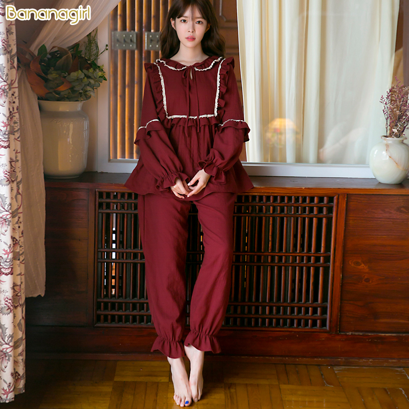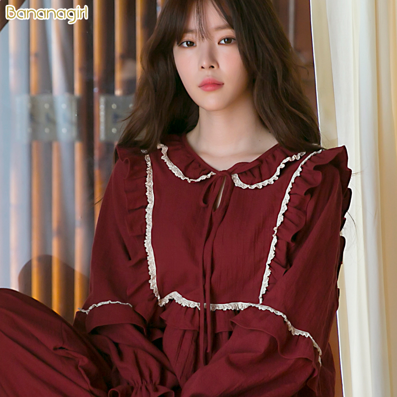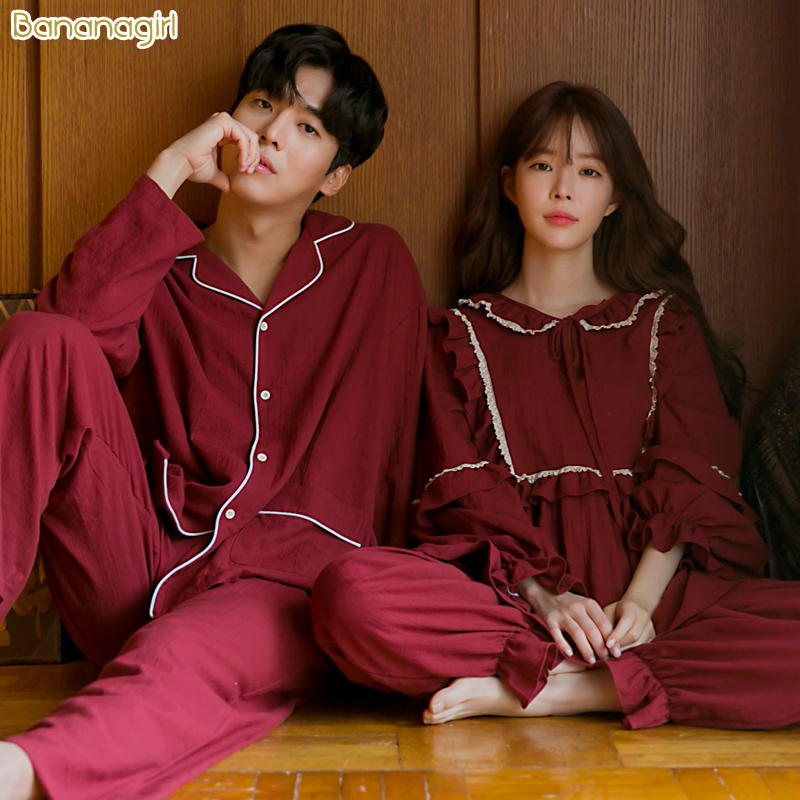 男春秋 带胸垫家居服套装 A类抗菌防螨纯棉情侣睡衣女长袖 红豆夏季