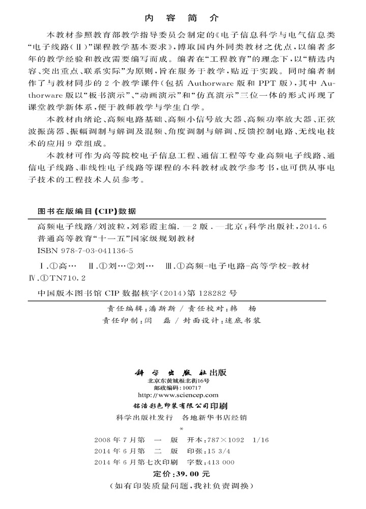 第二版 高频电子线路 刘波粒 刘彩霞主编 社 正版 科学出版 现货