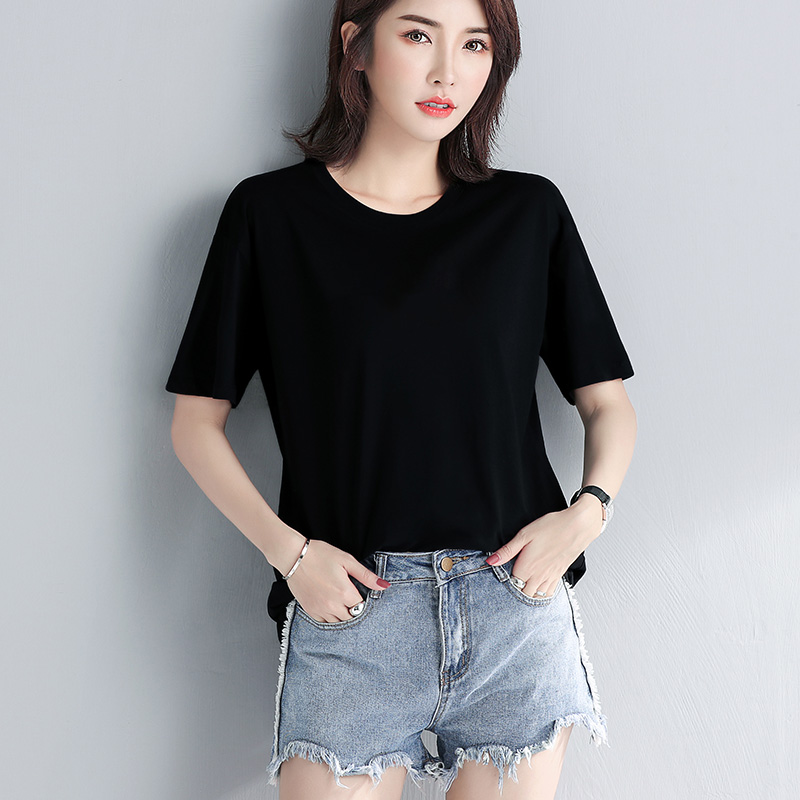 新款 t恤女纯棉夏季 圆领大码 半袖 黑色中长款 体恤打底衫 宽松短袖