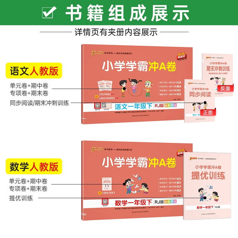 期中期末冲刺专项达标1一下全解读试 RJ人教1年级下同步阅读单元 2025春适用2本套装 pass绿卡小学学霸冲A卷一年级下册语文数学统编版
