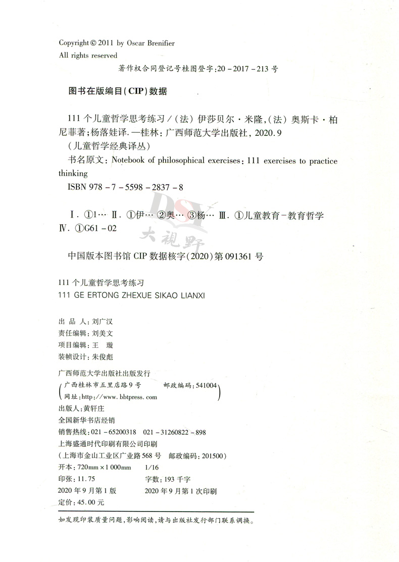 伊莎贝尔·米隆 奥斯卡·柏尼菲 广西师范大学出版 包邮 社 教育理论 111个儿童哲学思考练习 素质教育哲学知识读物 正版 著