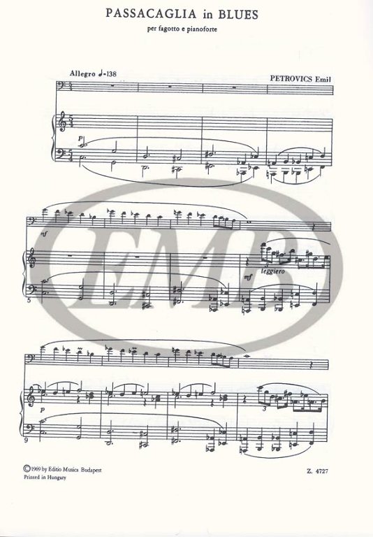 巴松管和钢琴 Z4727 Piano Passacaglia 彼得罗维斯 帕萨卡里亚舞曲 乐谱书 布达佩斯原版 Bassoon 埃米尔 Petrovics Blues Emil