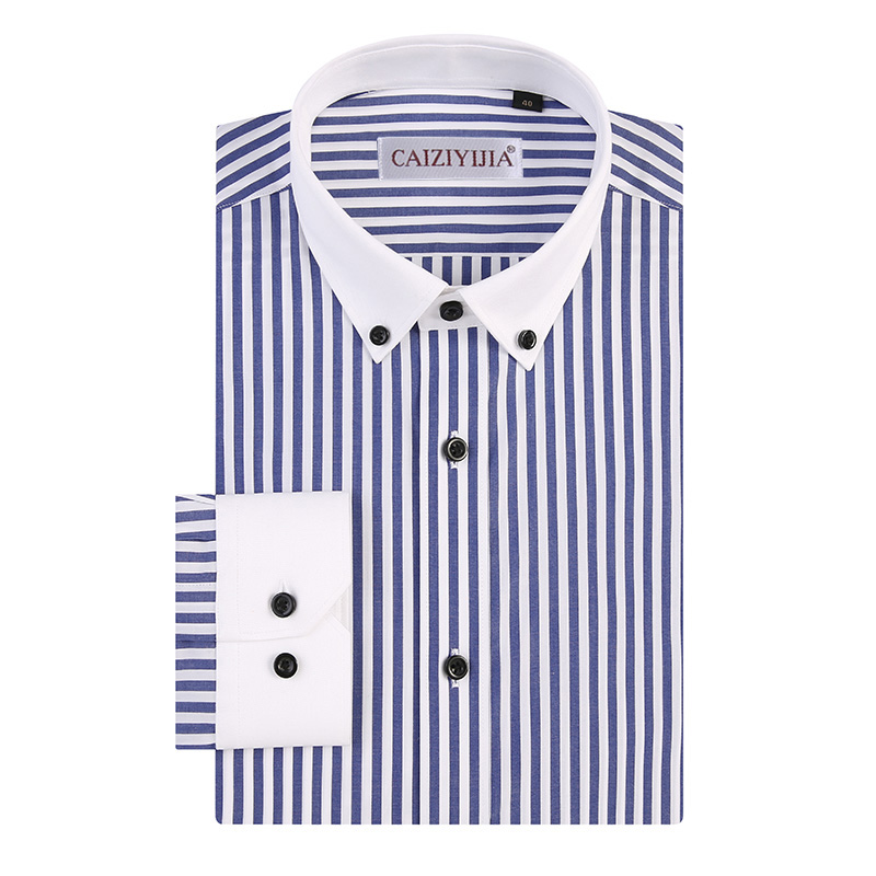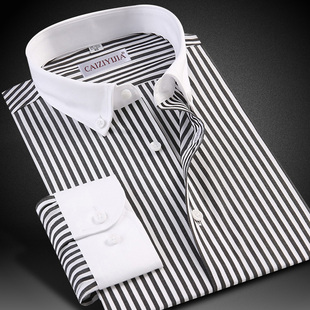 修身 男士 秋季 衬衫 潮流拼接商务休闲纯棉免烫白领衬衣 蓝色条纹长袖