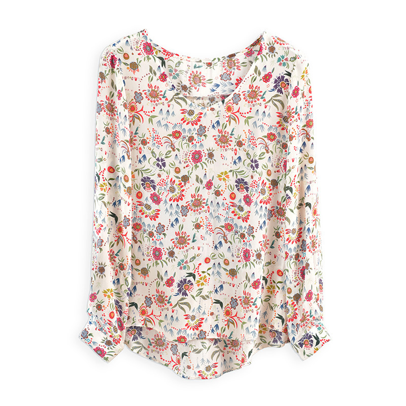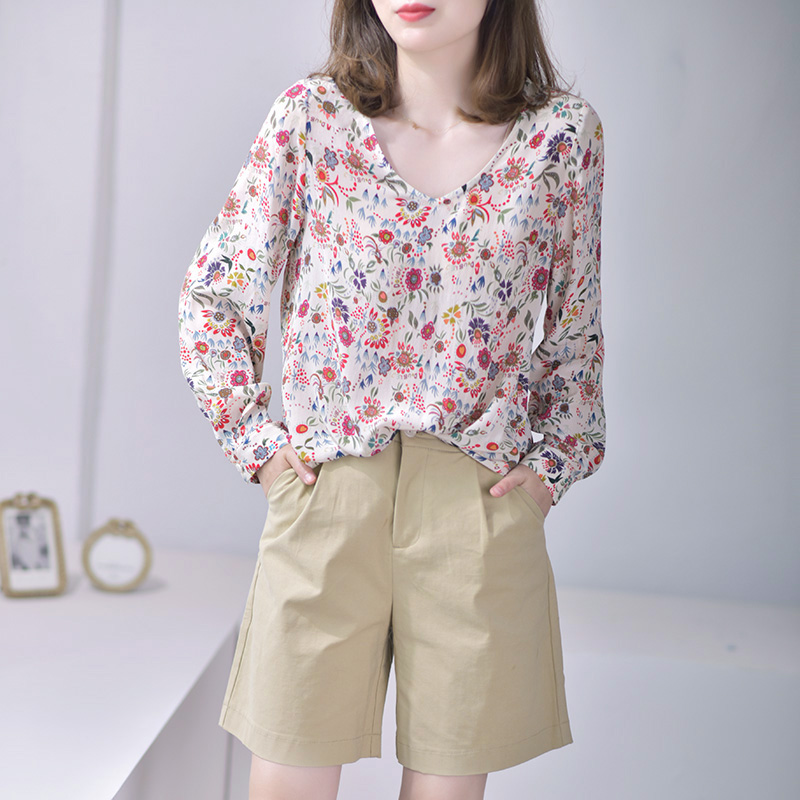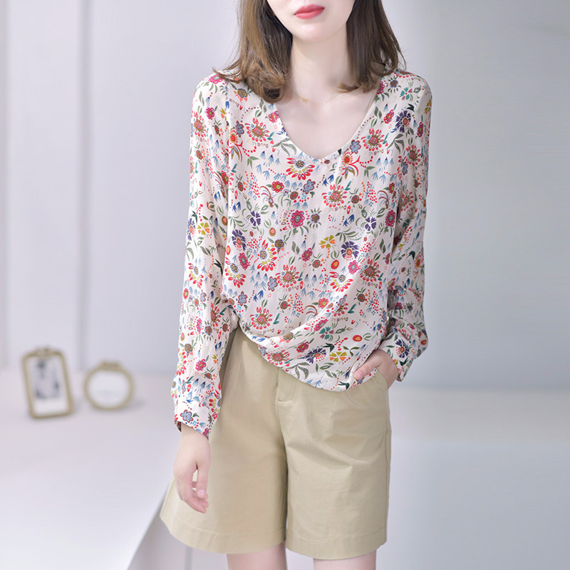 V领桑蚕丝上衣宽松设计感复古早秋薄 女长袖 法式 好看碎花真丝衬衫