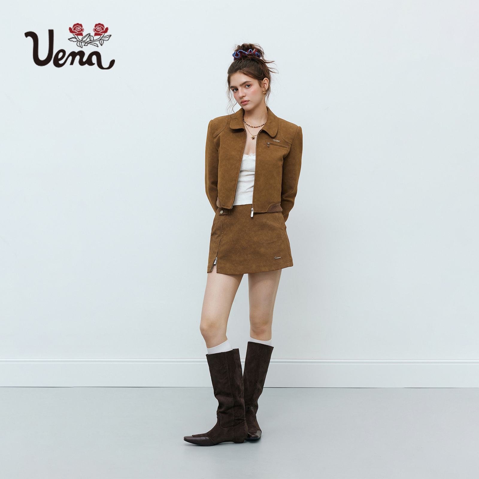 正肩仿麂皮夹克外套A字半身裙套装 Uena焦糖棕色短款 黄昏梦呓