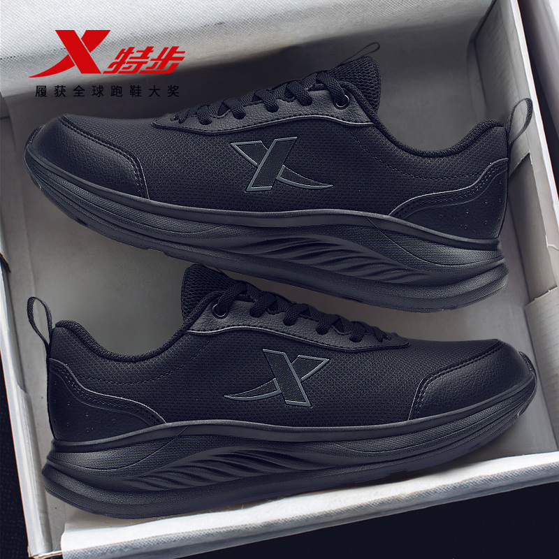 中年父亲爸爸鞋 男减震软底跑步鞋 革面防水轻便 黑色运动鞋 特步男鞋