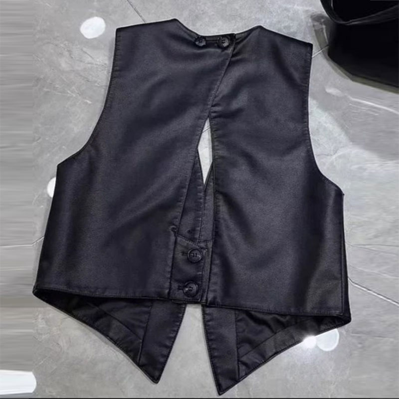 外套上衣 减龄百搭无袖 棕色宽松复古圆领pu皮衣马甲背心女秋季 新款