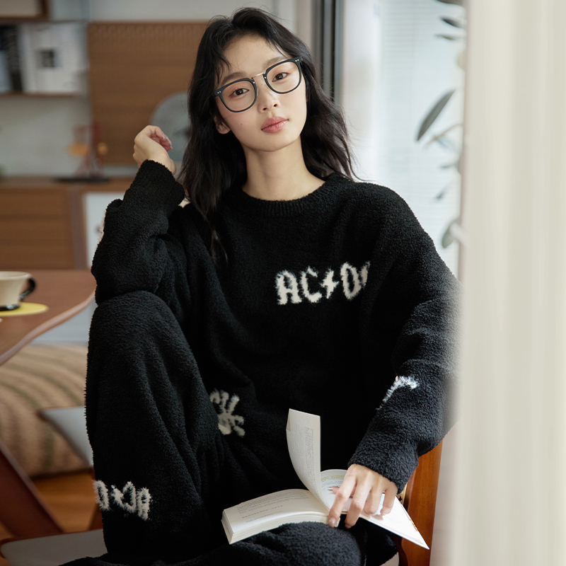 保暖家居服 2025新款 微醺小姐睡衣女套装 半边绒加绒黑色加厚冬季