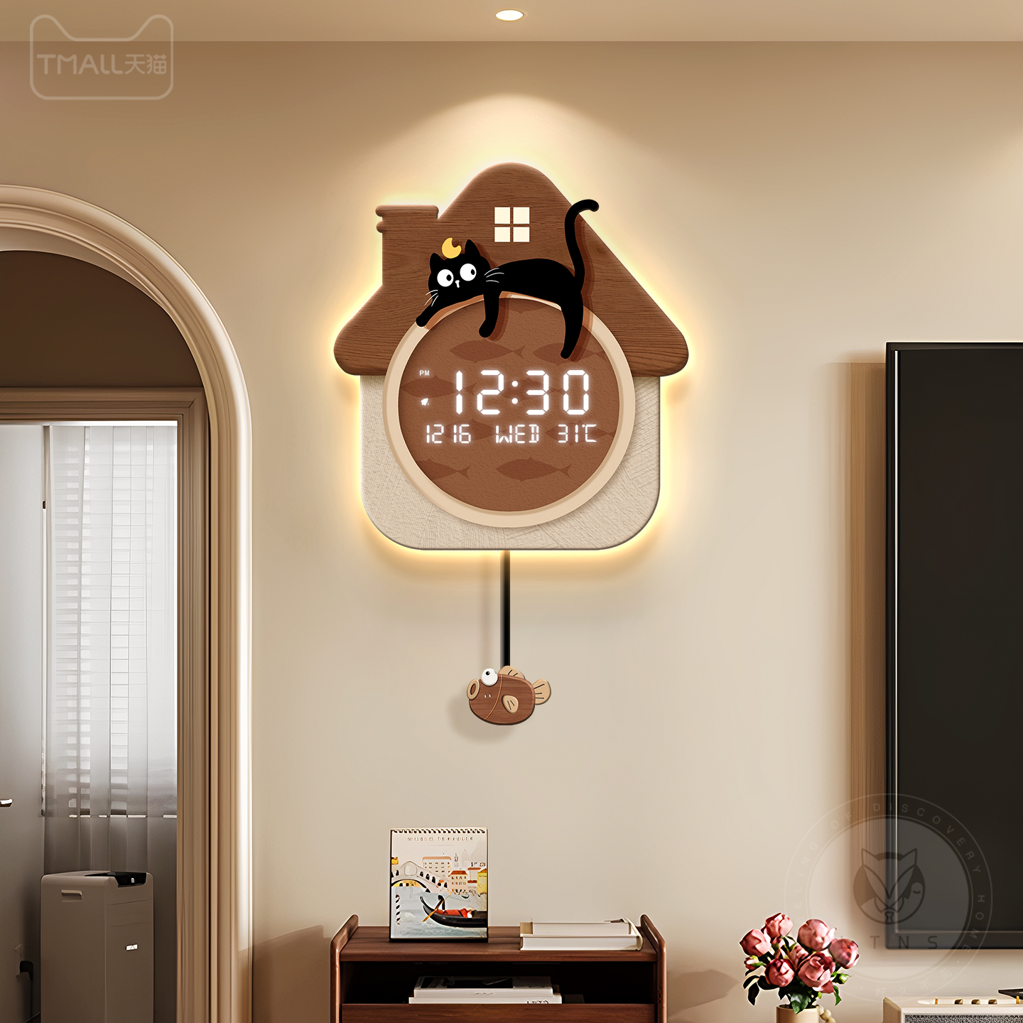 中古风客厅挂钟2025新款 数显万年历电子时钟复古猫咪创意挂墙钟表