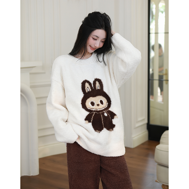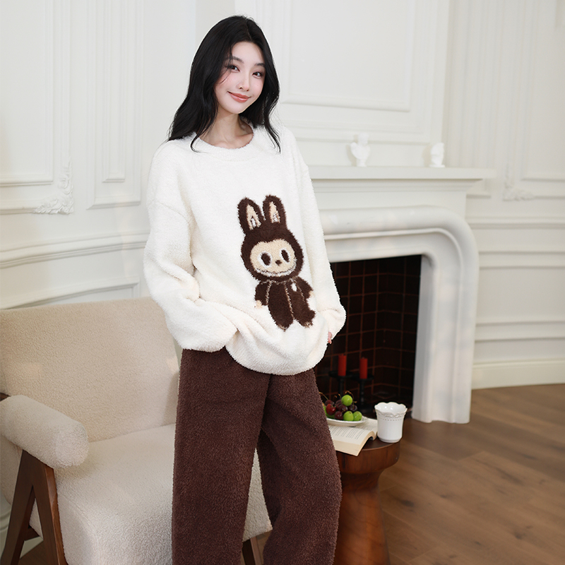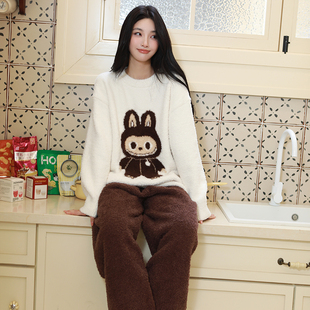 雪花绒锁温保暖可外穿宽松睡衣家居服秋冬天加绒加厚女法兰绒套装
