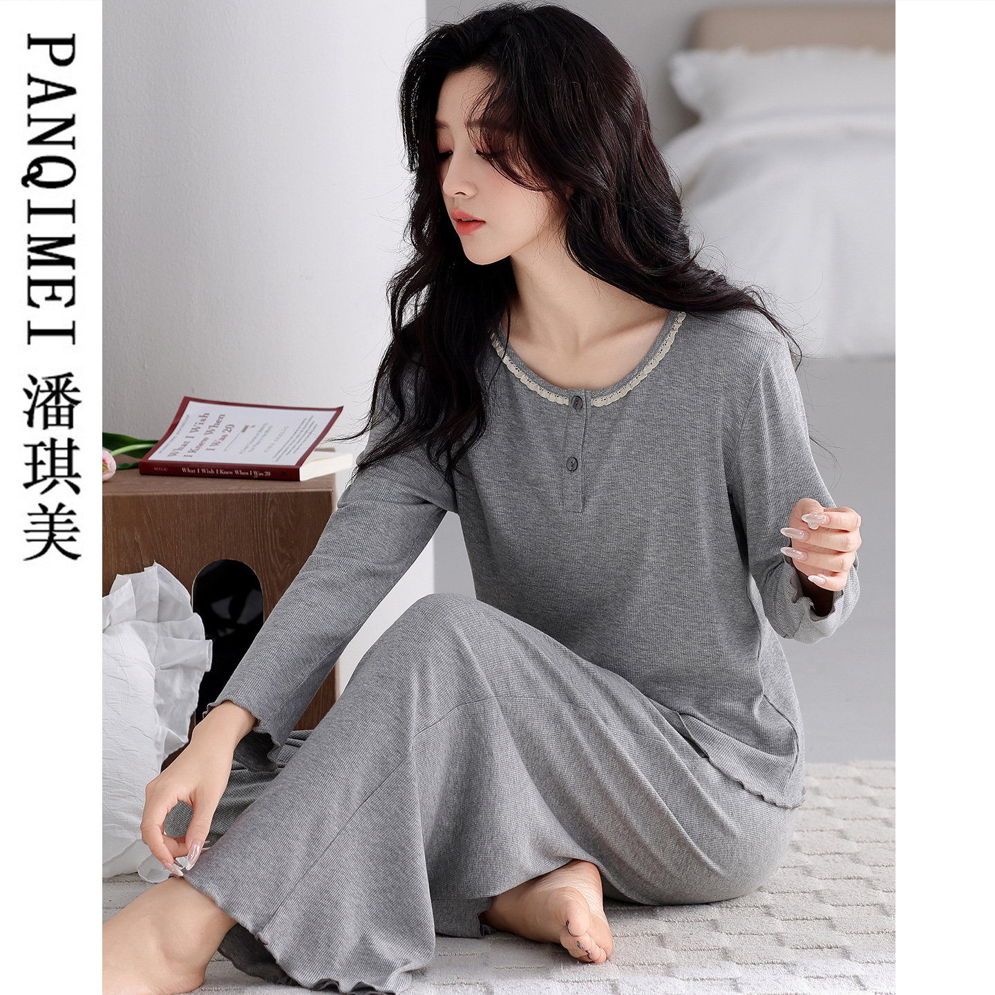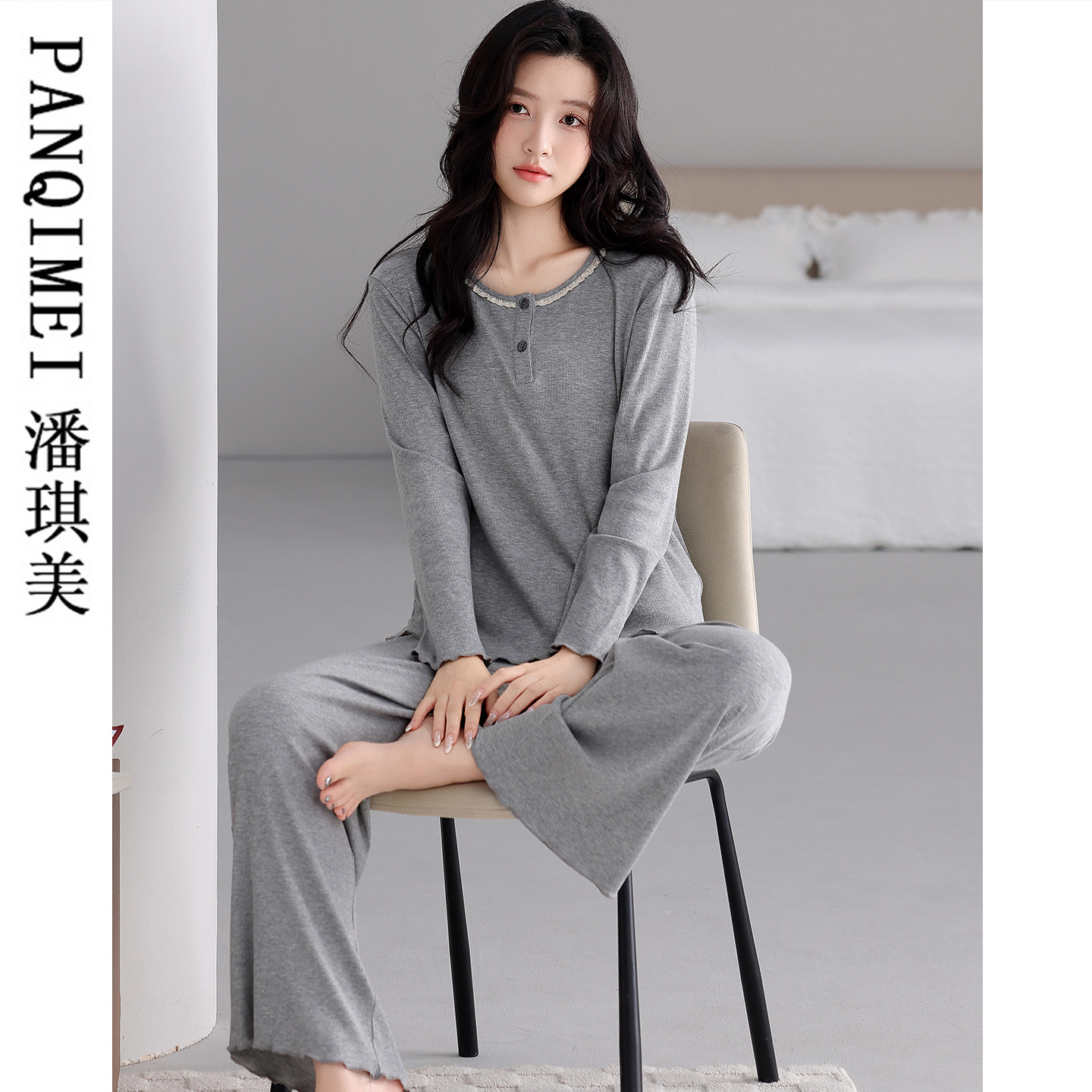 全棉套装 女士睡衣春秋款 无领家居服秋冬宽松大码 月子开衫 纯棉长袖