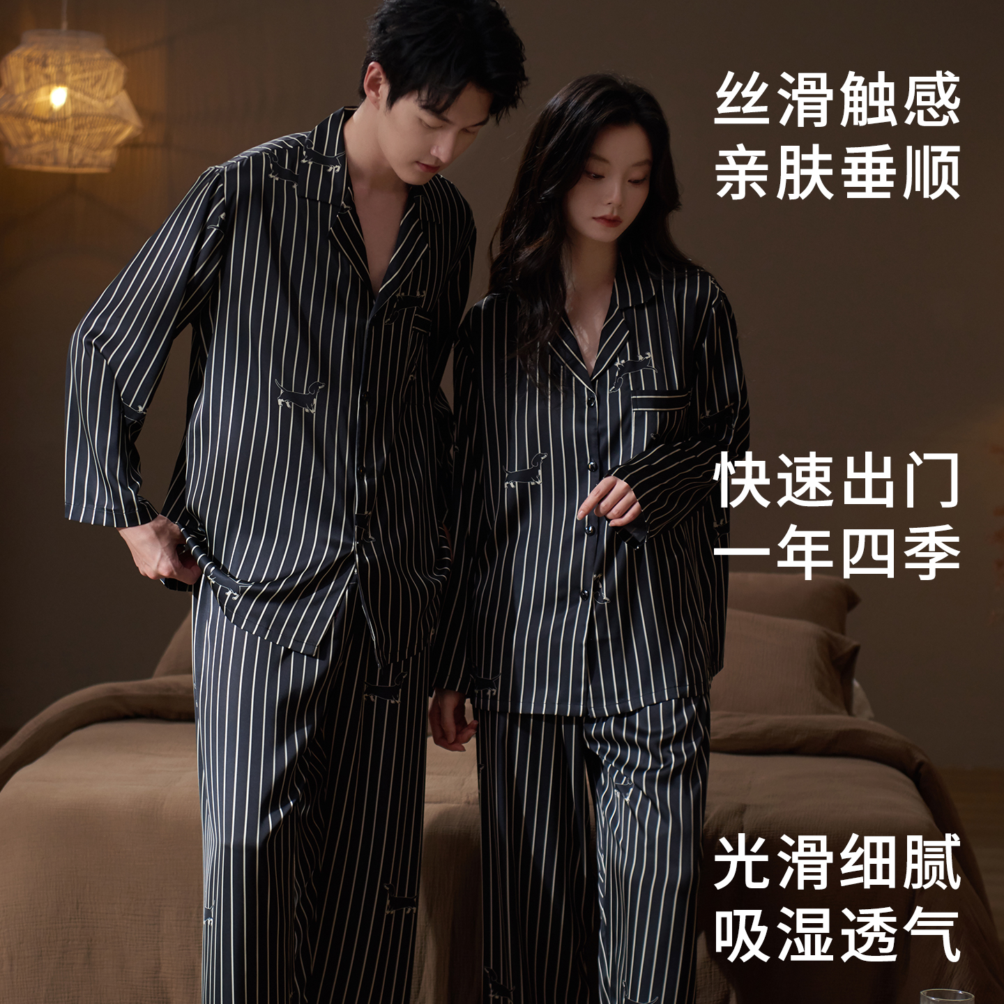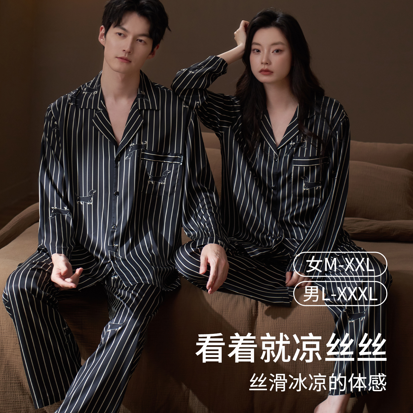 夏天睡衣男女款 条纹套装 家居服 柔软冰丝长袖 乐姿梦情侣睡衣春秋季