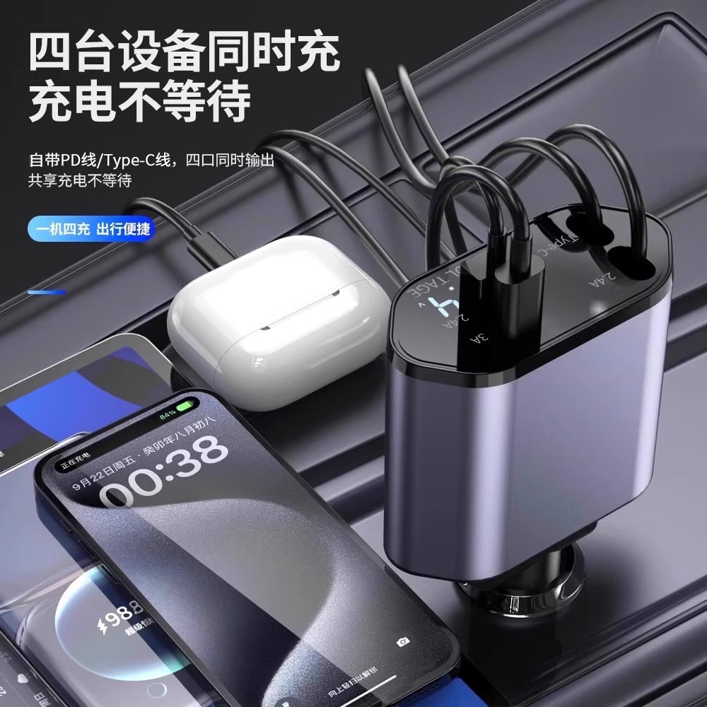 车载充电器240w超级快充一拖五自带伸缩线手机汽车点烟器转换插头