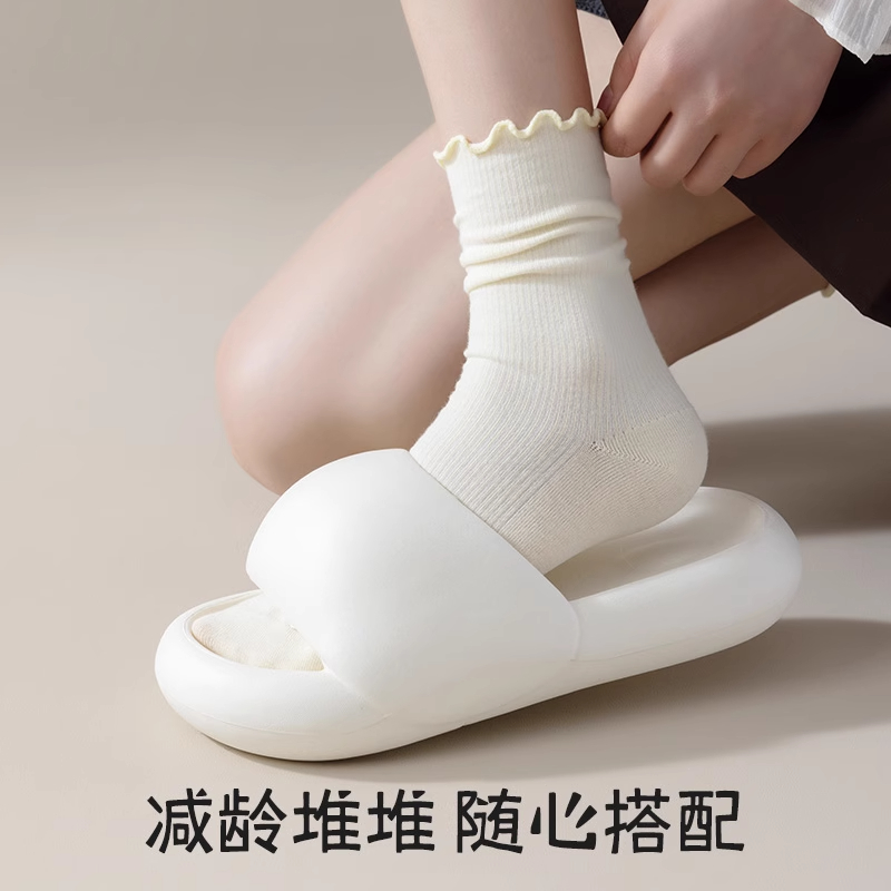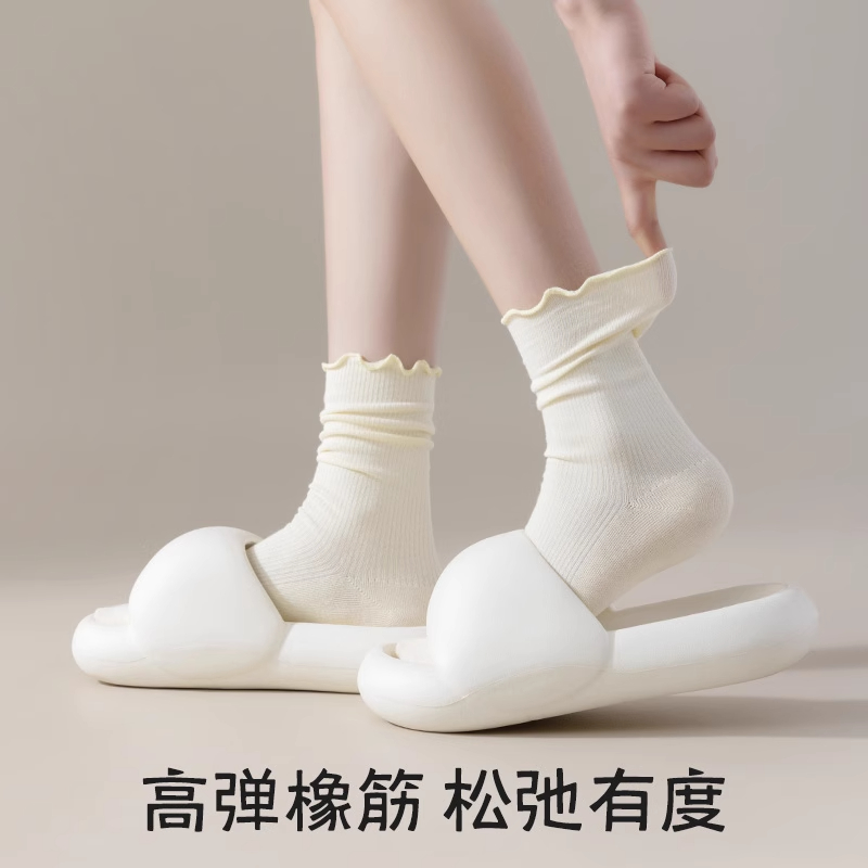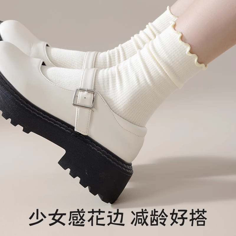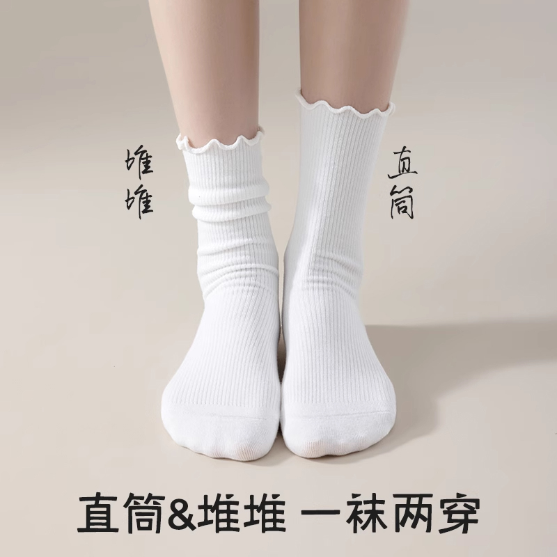纯棉长袜配小白鞋 袜子女秋冬季 白色中筒袜木耳花边无骨堆堆袜女款
