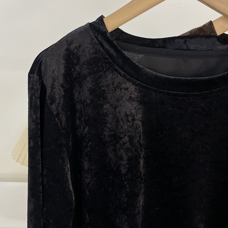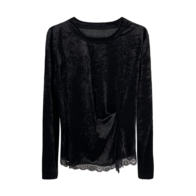 设计感褶皱蕾丝打底衫 正肩圆领上衣秋冬t恤洋气百搭显瘦小衫 女款