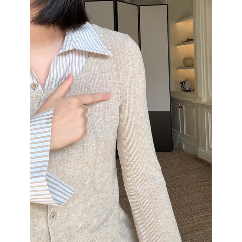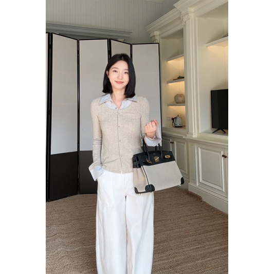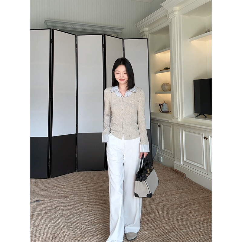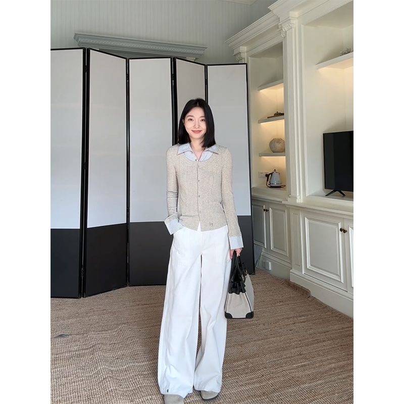 长裤 郭九九呢 阔腿牛仔裤 显瘦上衣秋季 气质假两件拼接条纹修身